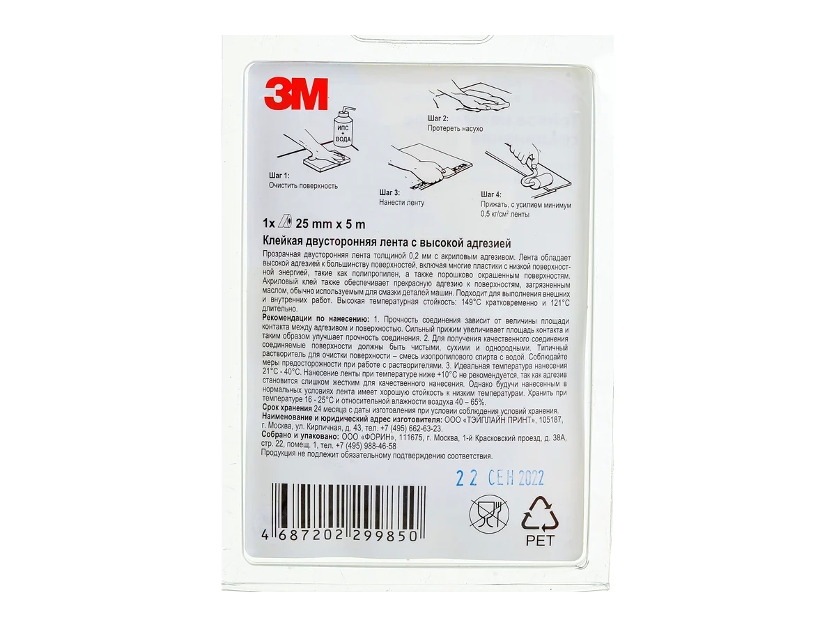 Клейкая двусторонняя лента 3М, с высокой адгезией, прозрачная, толщиной 0,2мм с акриловым адгезивом. Лента универсального применения - обладает высокой клеющей способностью к большинству поверхностей: пластики, полипропилен, окрашенные металлы, нержавеющая сталь, поликарбонат, алюминий, АБС-пластик и стекло. Она отлично выдерживает сдвиговые нагрузки и стойко держит отслаивание. Клей на акриловой основе хорошо держится даже на поверхностях загрязненных маслами и смазками. Всепогодная клейкая лента подходит для внутренних и внешних монтажных работ. При нанесении на сухую поверхность лента обладает высокой начальной адгезией и стойкостью к воздействию влаги. Диапазон температур: от -40 ˚С до +90 ˚С. Лента идеально подходит для различных областей применения, включая производство бытовой техники, промышленного оборудования, транспортных средств и потребительской электроники, а также изготовление вывесок и т. д.