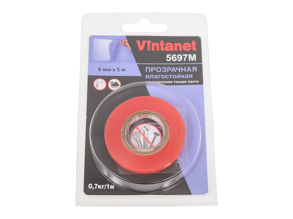 Лента Vintanet 5697М - прозрачная двусторонняя лента толщиной 0,2 мм с акриловым адгезивом на основе полиэфирной пленки. Лента обладает высокой начальной адгезией, стойкостью к влаге, максимальной прозрачностью. Отличается высокой прочностью на отслаивание и на сдвиг, прочно приклеивается к самым разным поверхностям, в том числе к дереву, металлу, стеклу, бумаге, многим пластикам и др. Высокая температурная стойкость – 120°С.