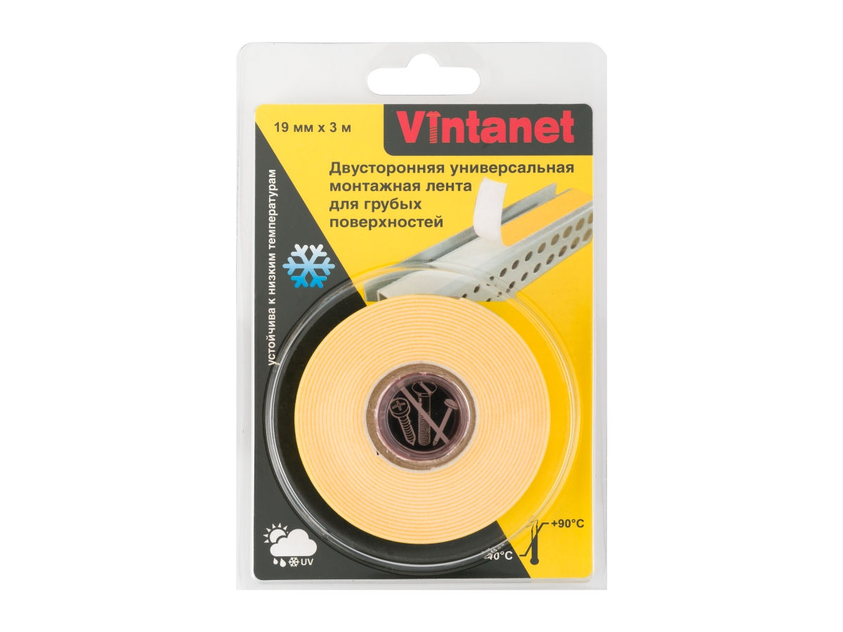 Двусторонняя универсальная монтажная лента для грубых поверхностей VINTANET VN115, 19 мм х 3 м VN115193 на вспененной основе с акриловым клеевым слоем обладает высокой прочностью на разрыв и устойчива к низким температурам. Лента обладает высокой упругостью на сдвиг, имеет хорошую начальную и конечную адгезию. Хорошая стойкость к старению и высокая устойчивость к воздействию химических веществ (бытовых чистящих и полирующих средств). Свойства акрилового клея и вспененной основы гарантирует очень хорошее скрепление даже на грубых и необработанных поверхностях. Подходит для соединения: различных пластиков, металлов, стекла, конструкций с шероховатой поверхностью и др. Позволяет заменить крепление на саморезах, болтах, гвоздях и клее, обеспечивая прочное долговременное соединение.