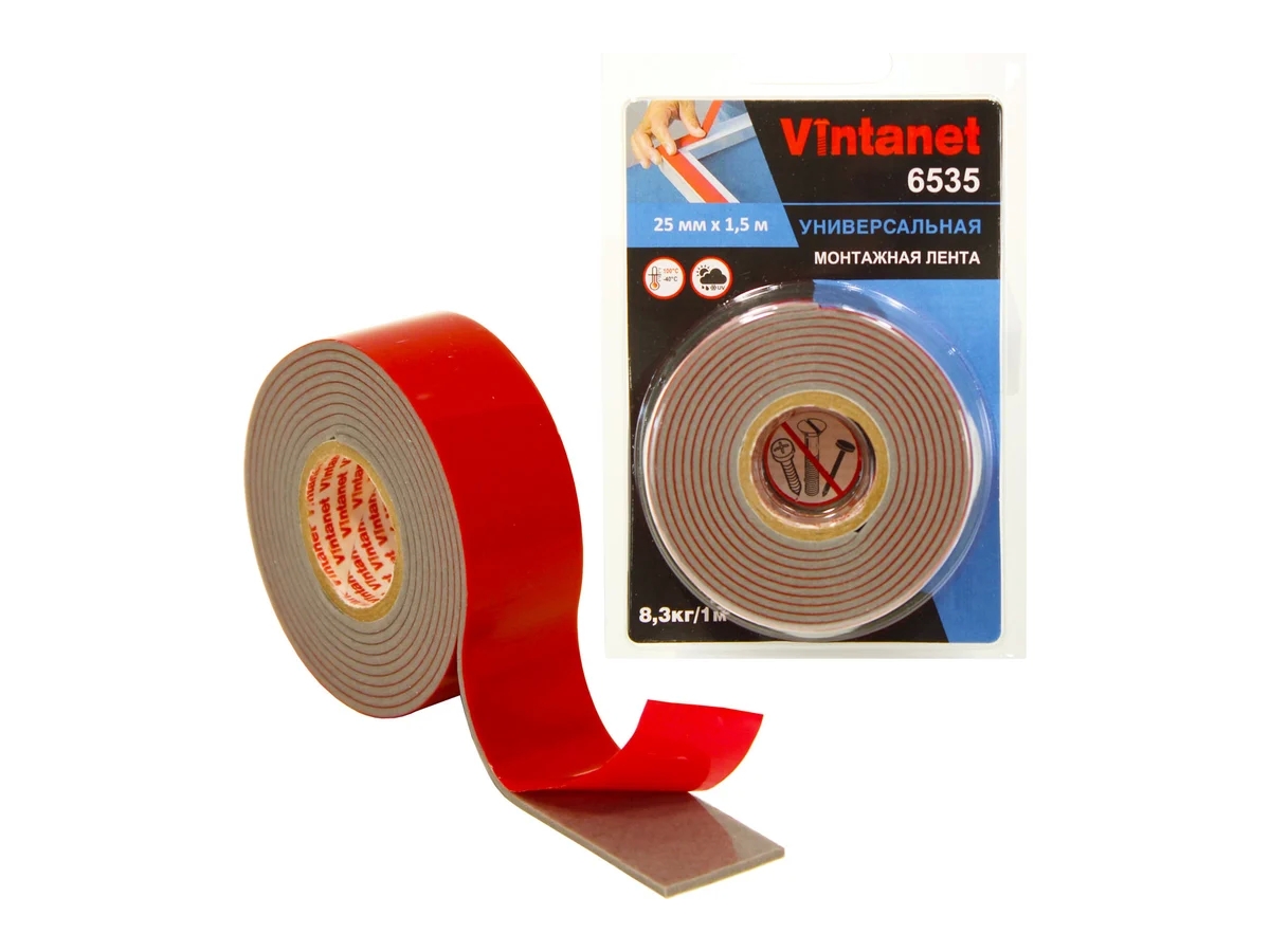 Лента Vintanet 6535 - двусторонняя клейкая лента толщиной 1,6 мм на основе 100% вспененного акрила. Лента предназначена для соединения разнообразных поверхностей, в том числе многих пластиков с высокой и средней поверхностной энергией, стекло, сталь, алюминий, керамика. Лента имеет очень высокую начальную адгезию. Лента специально разработана для склеивания материалов с высокой и средней поверхностной энергией типа ПВХ и АБС пластика. Лента способна компенсировать разницу коэффициентов температурного расширения склеенных материалов. В сочетании с праймером эта лента гарантирует превосходную адгезию на материалах с низкой поверхностной энергией.