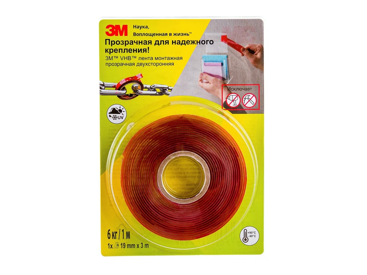 Монтажная лента 3M 4910F VHB, прозрачная, двусторонняя 19 мм х 3 м 4687202280834 идеальна для соединения прозрачных материалов или для случаев, когда необходима невидимая линия соединения. Подходит как для внутреннего, так и для наружного промышленного применения с самыми разнообразными поверхностями, включая загрунтованное дерево, большинство пластиков, композитов и металлов.
