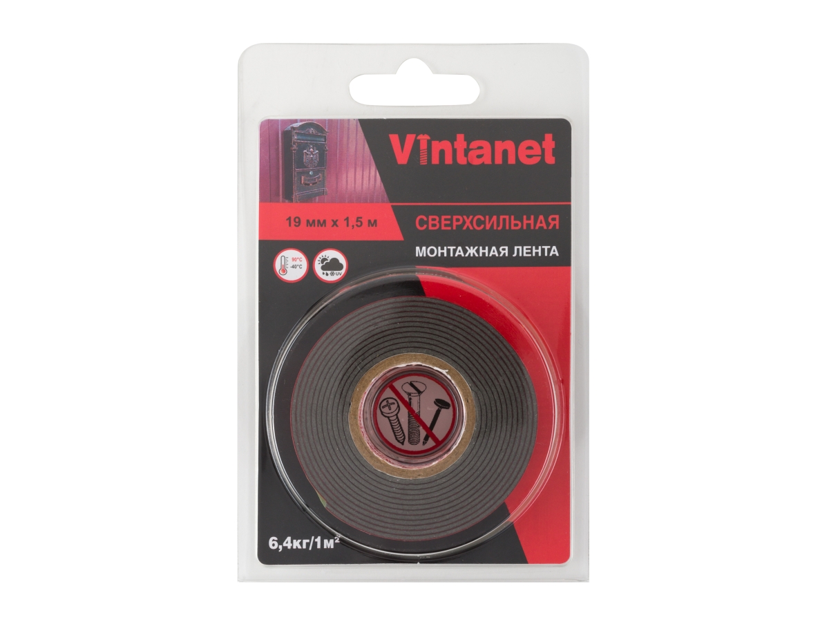 Монтажная сверхсильная клейкая двусторонняя лента Vintanet VN1146, цвет черный, 19 мм х 1,5 м VN11461915 обеспечивает высокопрочное неразрывное соединение, хорошо справляется с вибрационными нагрузками, показывает высокую стойкость на разрыв. Легко заменяет винты, саморезы, сварку и другие виды механического крепежа. Обеспечивает крепление по всей длине соединения, а клеевой слой проникает даже в шероховатые поверхности. Сверхсильная лента подходит для наружного и внутреннего применения, для крепления уличных фонарей, почтового ящика, огнетушителя, полок, органайзеров и других тяжелых предметов.