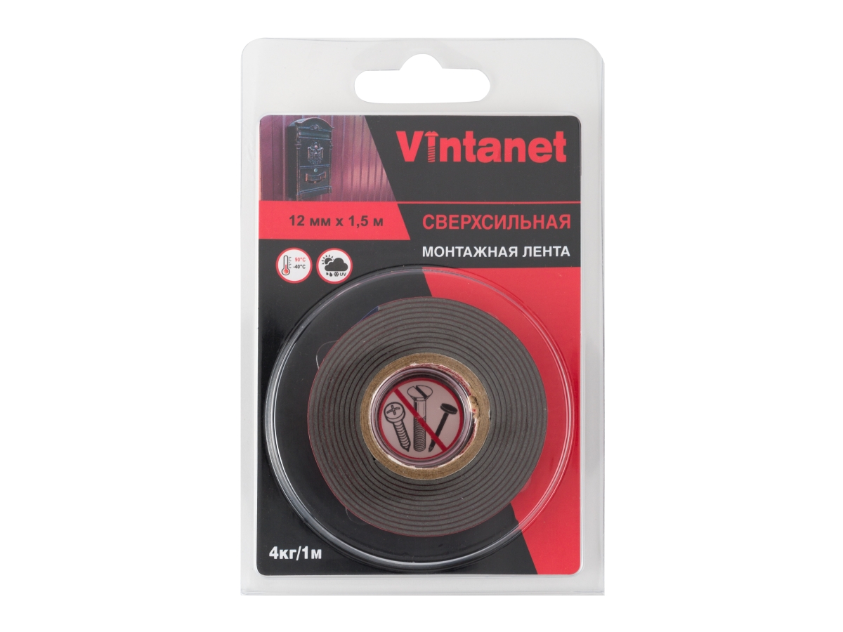 Монтажная сверхсильная клейкая двусторонняя лента Vintanet VN1146, цвет черный, 12 мм х 1,5 м VN11461215 обеспечивает высокопрочное неразрывное соединение, хорошо справляется с вибрационными нагрузками, показывает высокую стойкость на разрыв. Легко заменяет винты, саморезы, сварку и другие виды механического крепежа. Обеспечивает крепление по всей длине соединения, а клеевой слой проникает даже в шероховатые поверхности. Сверхсильная лента подходит для наружного и внутреннего применения, для крепления уличных фонарей, почтового ящика, огнетушителя, полок, органайзеров и других тяжелых предметов.