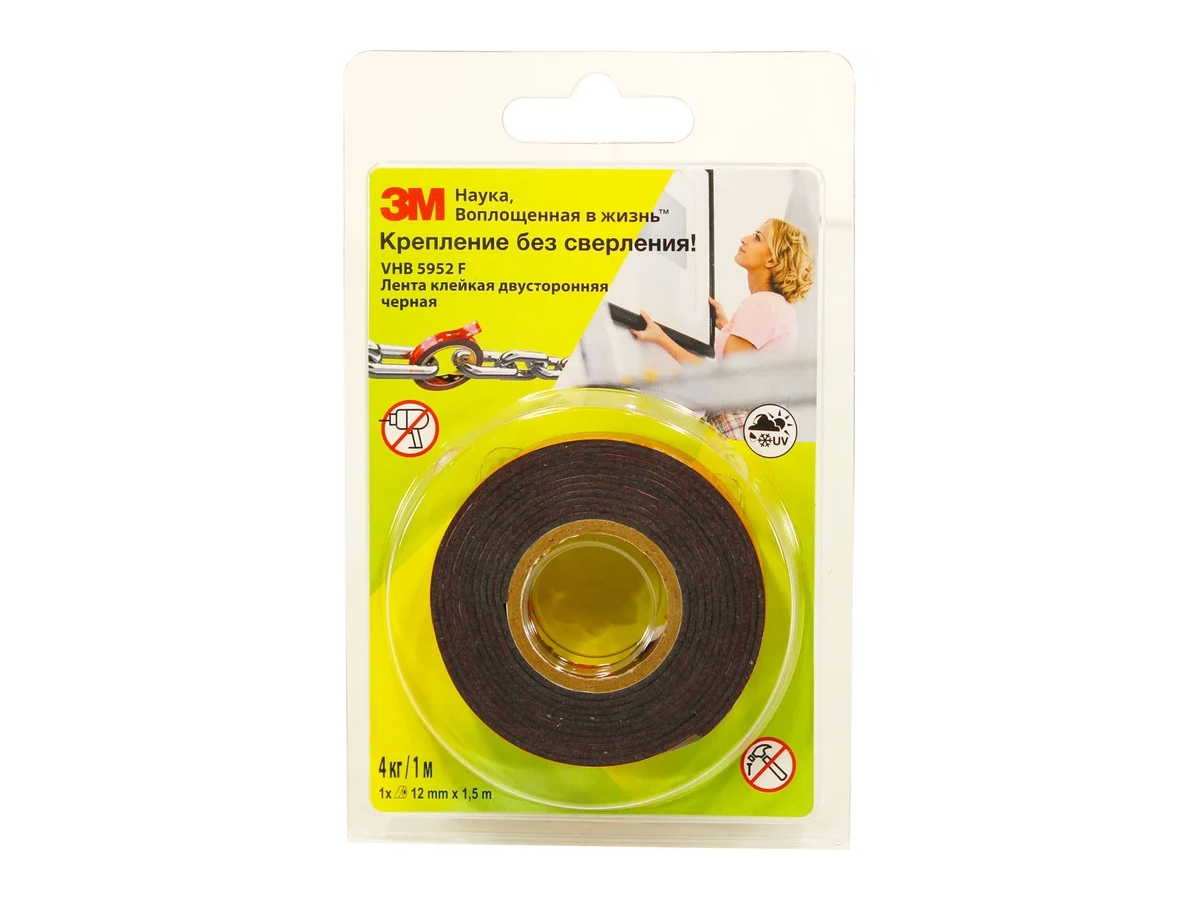 Монтажная универсальная лента 3М чёрная 12 мм х 1,5 м 4607166909497 способна заменить винты, заклепки, сварку, жидкий клей, а также другие способы долговременного соединения. Изделие распределяет нагрузку по всей длине соединения. Лента подойдет как для внутреннего, так и для наружного промышленного применения.