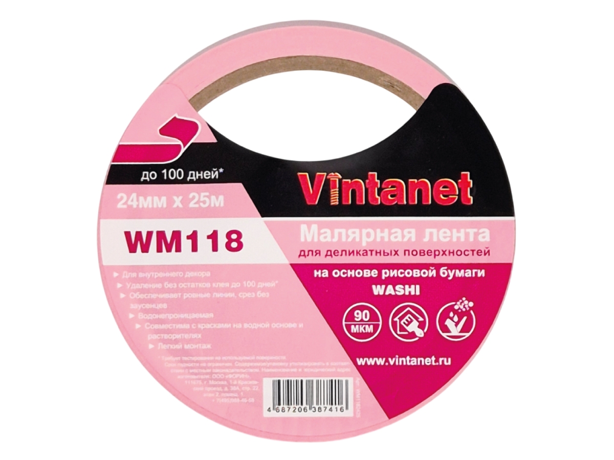 Идеальные линии, никаких подтеков и повреждений! Малярная лента VINTANET WM118 создана специально для деликатных поверхностей: обоев, дерева, свежеокрашенных стен и других покрытий, требующих особого внимания. Благодаря основе из рисовой бумаги и акриловому клею с низкой адгезией, лента легко может находиться на поверхности до 100 дней, и затем легко удаляется без следов клея и не повреждает покрытие.