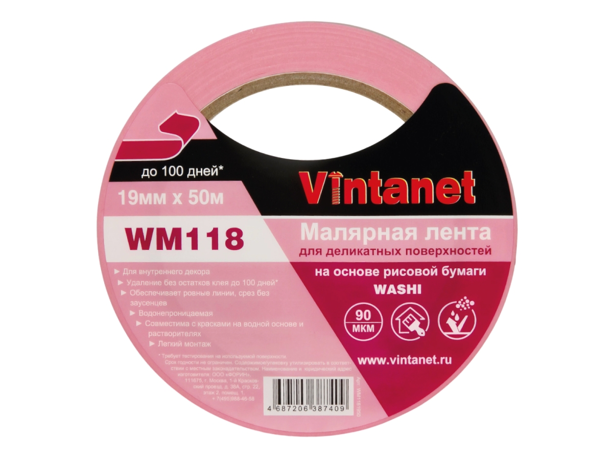 Идеальные линии, никаких подтеков и повреждений! Малярная лента VINTANET WM118 создана специально для деликатных поверхностей: обоев, дерева, свежеокрашенных стен и других покрытий, требующих особого внимания. Благодаря основе из рисовой бумаги и акриловому клею с низкой адгезией, лента легко может находиться на поверхности до 100 дней, и затем легко удаляется без следов клея и не повреждает покрытие.