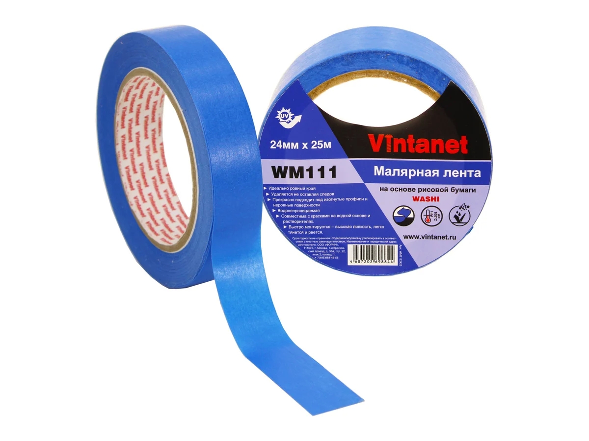 Малярная лента на основе рисовой бумаги Washi для четкого края VINTANET WM111, синяя, 24 мм х 25 м WM1112425 - односторонняя маскирующая лента изготовленная на основе WASHI бумаги с акриловым клеем на