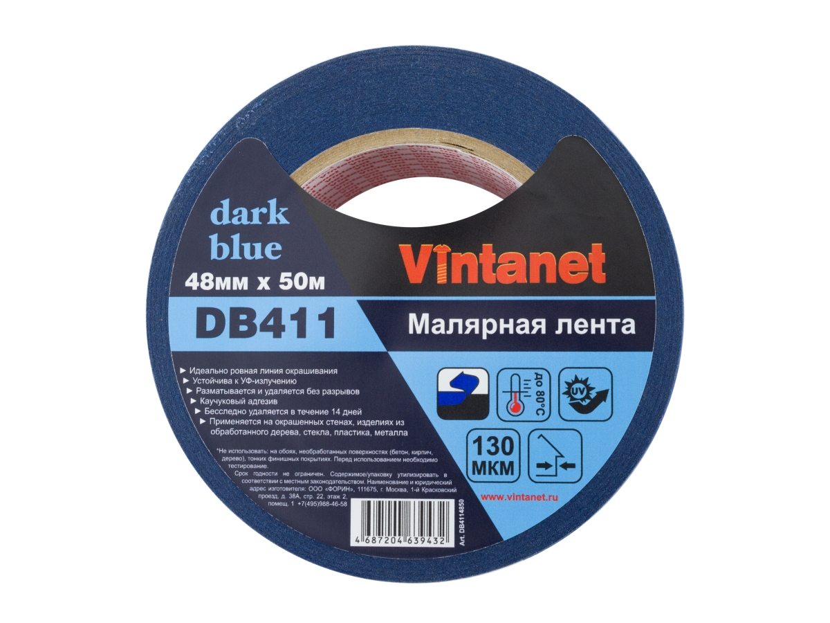 Лента DB411 Vintanet (аналог 3М 2090) - универсальная малярная лента, которая способна выдержать повторяющееся воздействие температуры до 80°C. Лента состоит из крепированной бумаги синего цвета, покрытой каучуковым адгезивом. Крепированная основа обеспечивает отличное прилегание в углах. Каучуковый адгезив обладает мгновенной адгезией.