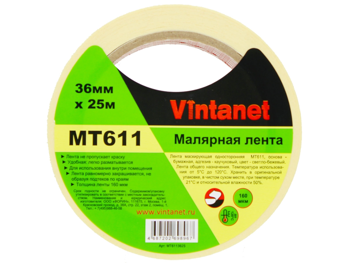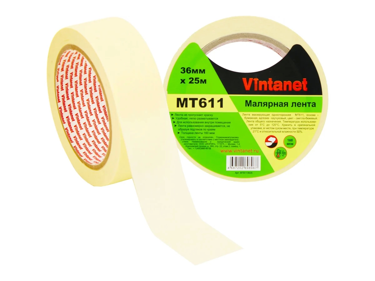 Малярная лента Vintanet 120С, MT611, 160 мкм, 36мм х 25м MT6113625 состоит из крепированной бумаги светло-бежевого цвета, покрытой каучуковым адгезивом. Крепированная основа обеспечивает отличное прилегание в углах. Каучуковый адгезив обладает мгновенной адгезией. Лента создана для внутреннего использования и не должна долго находится под воздействием окружающей среды (солнце, дождь), т.к. это может привести к сложностям при удалении. Применяется в покраске, при отделочных работах, в электронной промышленности. Чистое удаление с большинства поверхностей. Лента не пропускает краску, равномерно закрашивается, не образуя подтёков по краям.