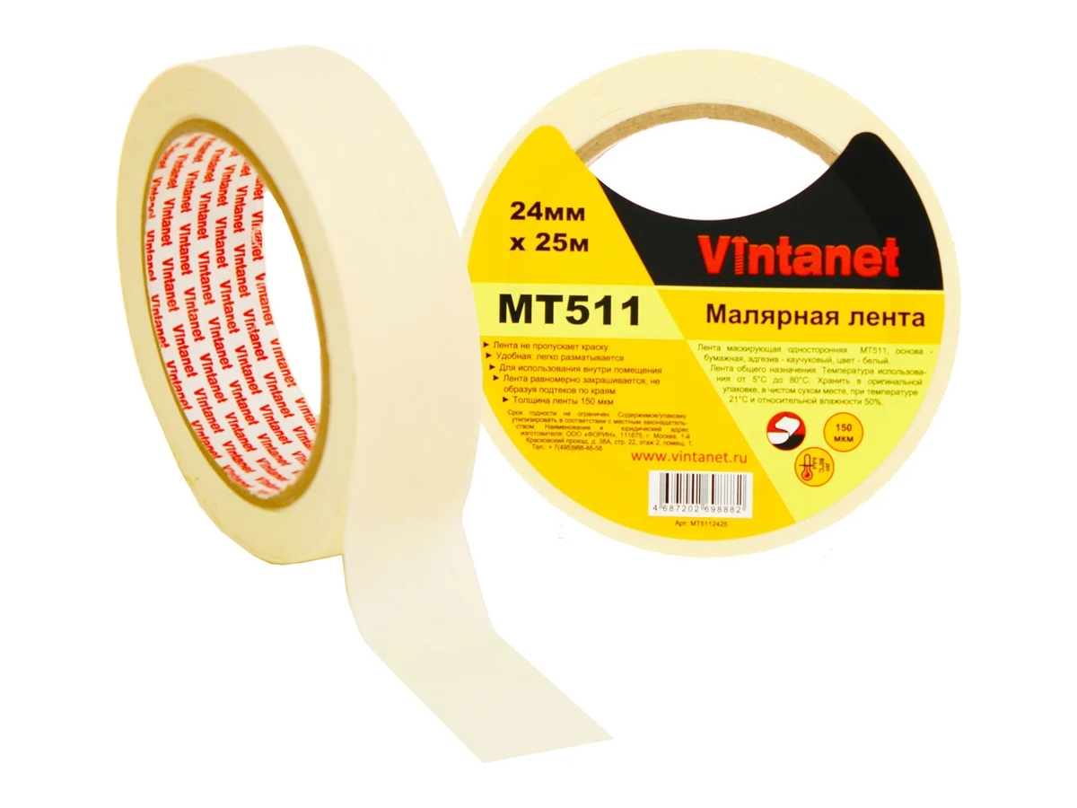 Малярная лента Vintanet 80С, MT511, 150 мкм, 24мм х 25м MT5112425 состоит из крепированной бумаги светло-бежевого цвета, покрытой каучуковым адгезивом. Крепированная основа обеспечивает отличное прилегание в углах. Каучуковый адгезив обладает мгновенной адгезией. Лента создана для внутреннего использования и не должна долго находится под воздействием окружающей среды (солнце, дождь), т.к. это может привести к сложностям при удалении. Применяется в покраске, при отделочных работах, в электронной промышленности. Чистое удаление с большинства поверхностей. Лента не пропускает краску, равномерно закрашивается, не образуя подтёков по краям.
