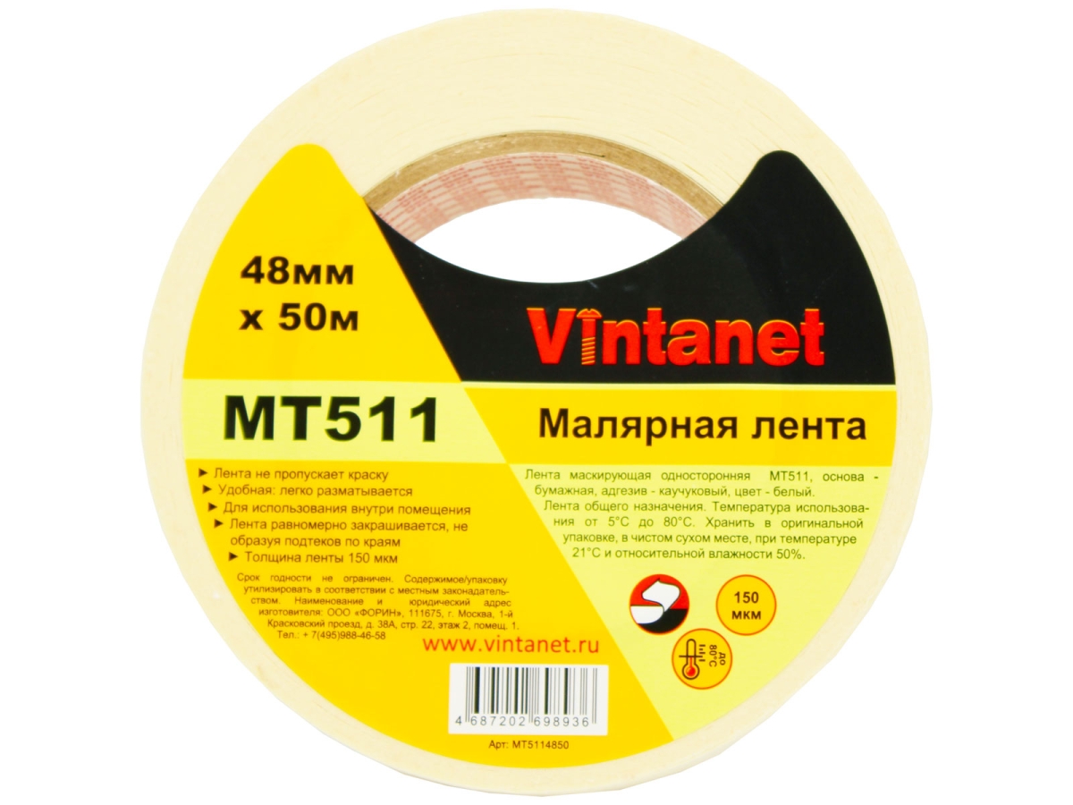Малярная лента Vintanet 80С, MT511, 150 мкм, 48мм х 50м MT5114850 состоит из крепированной бумаги светло-бежевого цвета, покрытой каучуковым адгезивом. Крепированная основа обеспечивает отличное прилегание в углах. Каучуковый адгезив обладает мгновенной адгезией. Лента создана для внутреннего использования и не должна долго находится под воздействием окружающей среды (солнце, дождь), т.к. это может привести к сложностям при удалении. Применяется в покраске, при отделочных работах, в электронной промышленности. Чистое удаление с большинства поверхностей. Лента не пропускает краску, равномерно закрашивается, не образуя подтёков по краям.