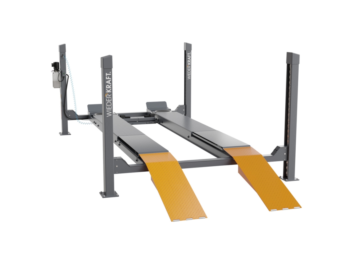 Четырехстоечный гидравлический подъёмник WiederKraft WDK-540 грузоподъемностью до 4000 кг. Применяется для регулировки развал-схождения и отличается высокой надежностью конструкции, наличием современной системой защиты от повреждения (кабеля при подъеме, от перегрузки по весу, от повреждения электропроводки). Подъемник модели WDK-540 оборудован двойным устройством безопасности: если замки безопасности у платформ не сработают, подъемник будет автоматически заблокирован дублирующим устройством. Пневматическое управление стопорами с центрального пульта и траверсой, изменяемое расстояние колеи, позволяет охватить широкий спектр задач и сделать подъемник универсальным. Эффективная длина подъемника составляет 4555 мм, что позволяет разместить на нем как легковой, так и легкий коммерческий автомобиль. Комплектация подъемника включает в себя траверсу грузоподъемностью 2 тонны и задние сдвижные платформы для измерения геометрии и развал-схождения.