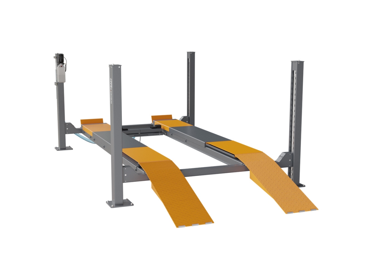 Четырехстоечный гидравлический подъёмник WiederKraft WDK-545 грузоподъемностью до 5000 кг. Применяется для регулировки развал-схождения и отличается высокой надежностью конструкции, наличием современной системой защиты от повреждения (кабеля при подъеме, от перегрузки по весу, от повреждения электропроводки). Подъемник модели WDK-545 оборудован двойным устройством безопасности: если замки безопасности у платформ не сработают, подъемник будет автоматически заблокирован дублирующим устройством. Пневматическое управление стопорами с центрального пульта и траверсой, изменяемое расстояние колеи, позволяет охватить широкий спектр задач и сделать подъемник универсальным. Эффективная длина подъемника составляет 5100 мм, что позволяет разместить на нем как легковой, так и легкий коммерческий автомобиль. Комплектация подъемника включает в себя траверсу грузоподъемностью 2 тонны и задние сдвижные платформы для измерения геометрии и развал-схождения.