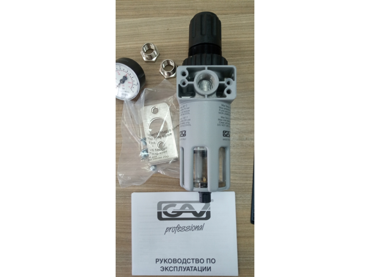 Фильтр FR-200 3/8 GAV предназначен для очистки от влаги и пыли сжатого воздуха, поступающего от компрессора. На корпусе имеется вентиль для регулировки давления, таким образом, фильтр также выполняет функцию регулятора.