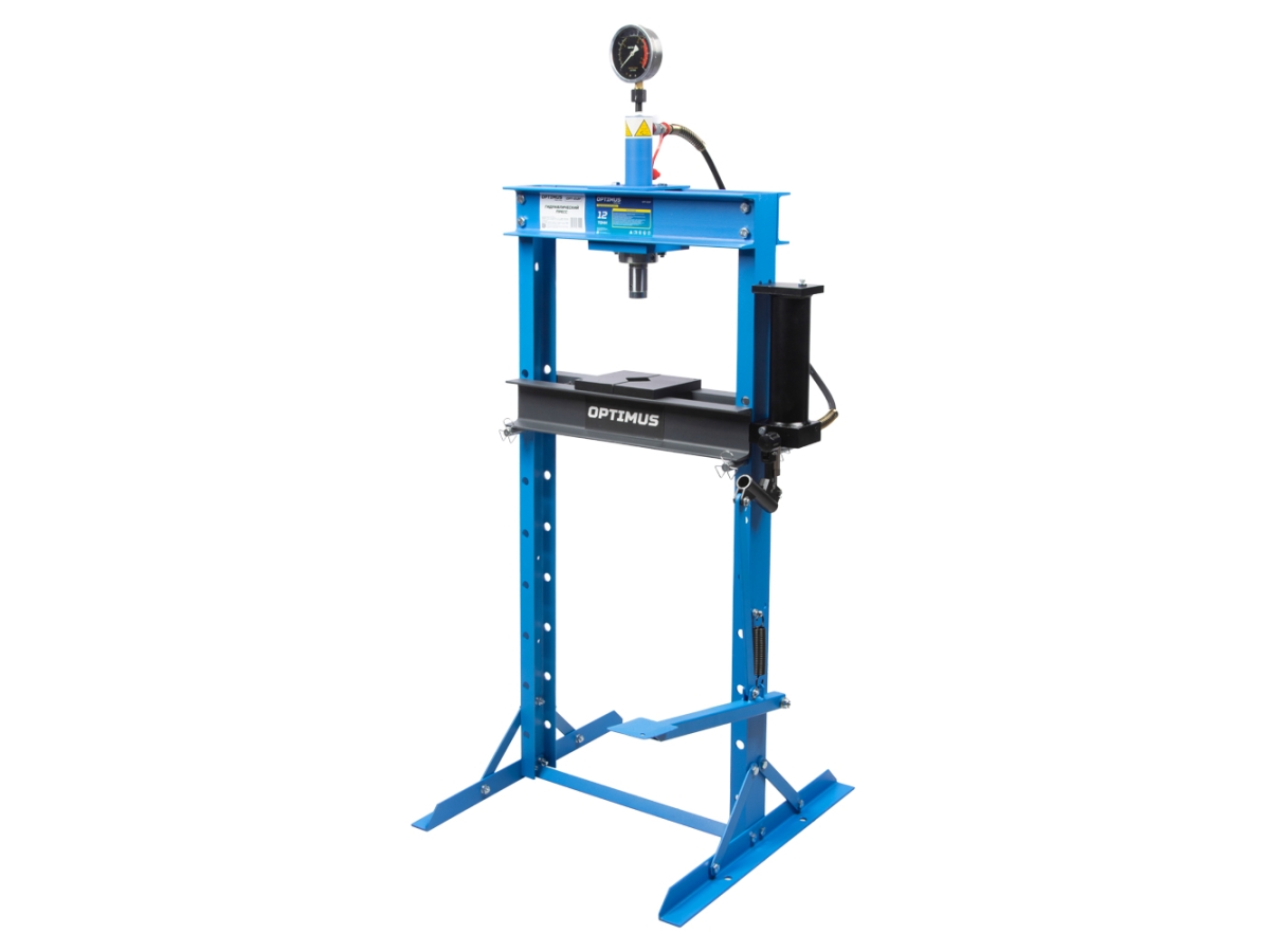 Напольный гидравлический пресс OPTIMUS OPT-212F, оснащенный ручным и ножным приводом и обеспечивающий усилие в 12000 кг. Используется в автосервисах, СТО и производстве для запрессовки деталей различных размеров, выпрессовки втулок, снятия и установки подшипников, гибки металла. Жидкостный манометр, защищенный от гидроудара, упрощает контроль за развиваемым усилием. Рабочий стол легко и просто регулируется по высоте от 225 до 1060 мм, что позволяет устанавливать детали различных габаритов. Цилиндр имеет возможность горизонтального перемещения для работы по всей плоскости стола. Жесткая и прочная сварная рама обеспечивает долговечность оборудования даже при интенсивной эксплуатации.