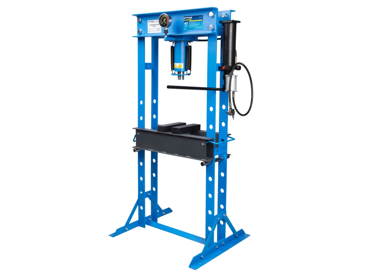 Напольный пневмогидравлический пресс OPTIMUS OPT-240, который обеспечивает усилие в 40000 кг. Применяется в машиностроении и металлообработке, на различных производствах для запрессовки или выпрессовки втулок, коленвала, снятия или установки подшипников для автомобиля, сжатия всевозможных деталей, для гибки арматуры или листового металла. Станок оснащен ручным гидравлическим приводом и пневматическим насосом, который работает от источника сжатого воздуха, ускоряя выполнение операций. Поршень гидросистемы автоматически возвращается в исходное положение после завершения рабочей операции. Для удобного контроля давления на уровне глаз оператора располагается заполненный глицерином манометр. Подвижный цилиндр смещается по горизонтали и тем самым расширяет возможности применения модели. Рабочий стол легко и просто регулируется по высоте от 380 до 1400 мм, что позволяет устанавливать детали различных габаритов. Жесткая и прочная сварная рама обеспечивает долговечность оборудования даже при интенсивной эксплуатации. Насос и цилиндр пресса соединены прочным шлангом.