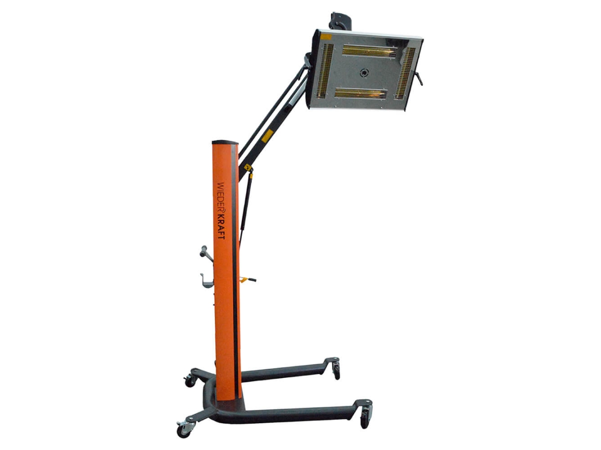 Мобильная ИК-сушка на пантографической стойке. Стойка прибора оборудована газовым амортизатором для поддержки и изменения положения. Размещенный на ней блок из 4 коротковолновых ИК-ламп легко поднимается на высоту до 2300 мм.