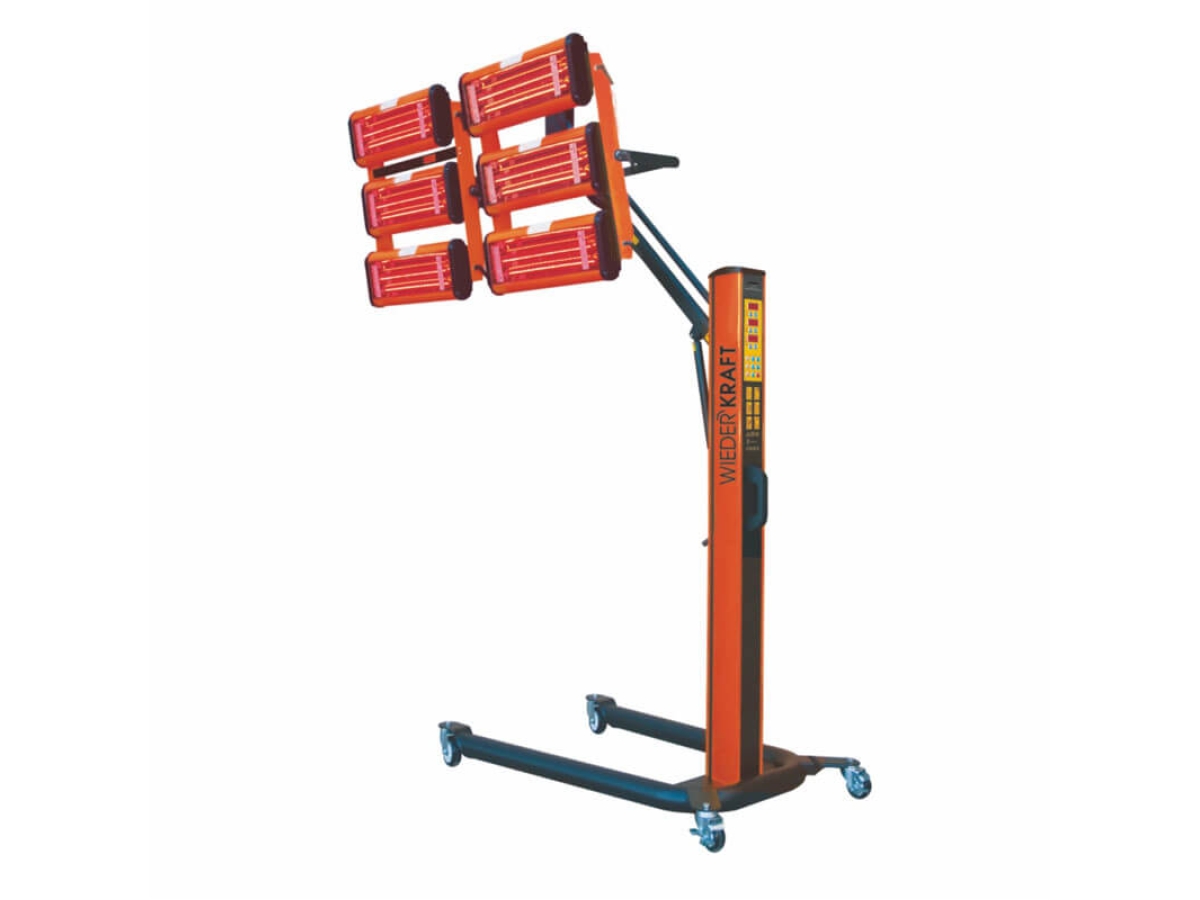 Мобильная шестикассетная инфракрасная установка для сушки лакокрасочных покрытий ИК-излучением. Два блока из трех кассет с коротковолновыми ИК-лампами размещены на пантографической стойке. Кассетный блок легко поднимается на высоту 2300 мм, позволяя сушить даже крышу автомобиля. Стойка прибора оборудована газовым амортизатором для поддержки и изменения положения кассетного блока.