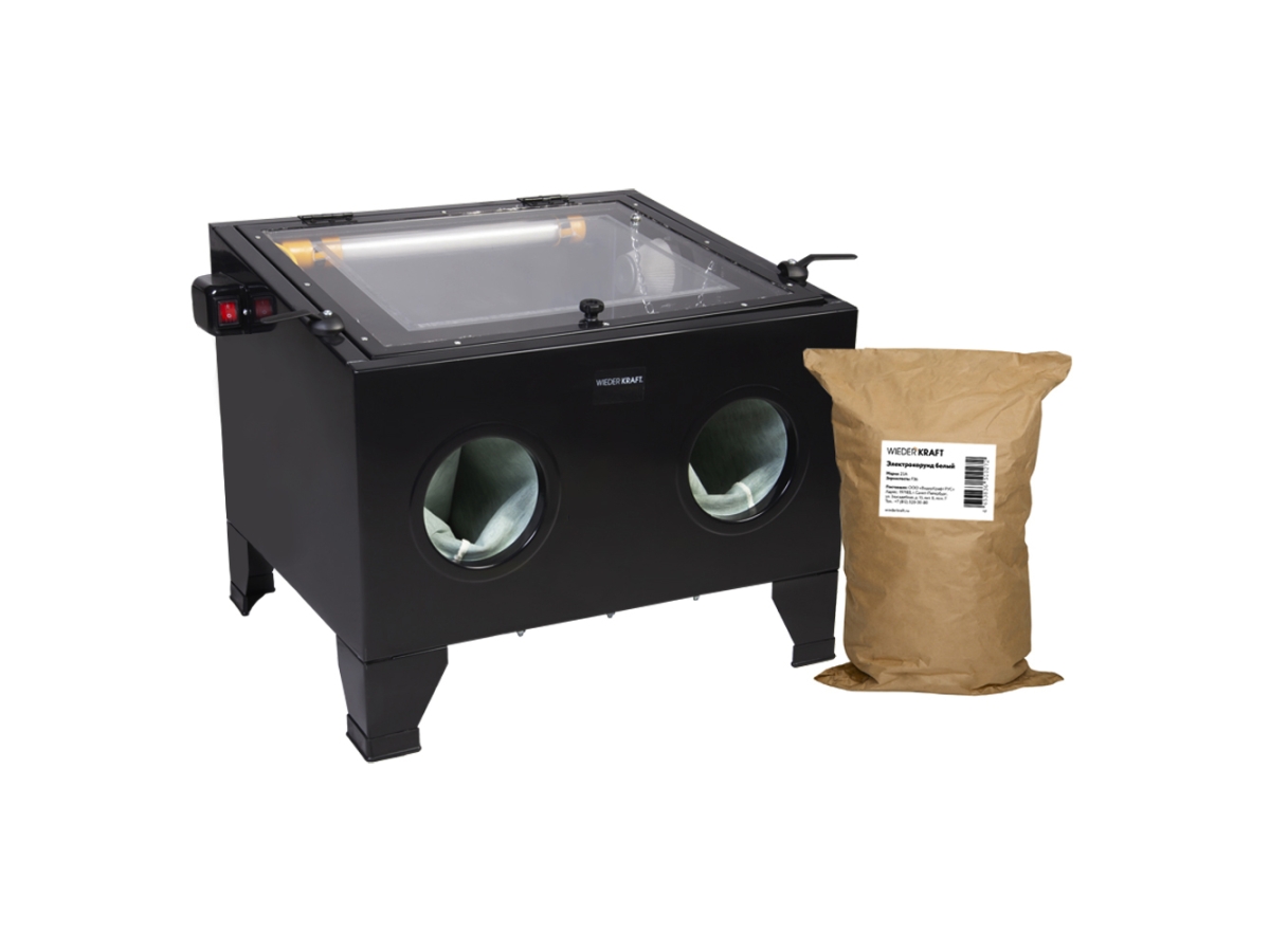 Настольная пескоструйная камера с системой очистки воздуха WiederKraft WDK-82090K объемом 90 литров, которая поставляется в комплекте с белым электрокорундом M25 (зерно F36, 20 кг). Предназначена для обработки деталей внутри замкнутого пространства самой камеры, что позволяет полностью предотвратить пылеобразование за ее пределами. Позволяет эффективно удалять с поверхности деталей ржавчину, окалину, формовочный грунт, слои краски, заусенцы, а также сглаживать шероховатости. Пескоструйная камера WDK-82090K оснащена электропневматической системой управления, смотровым окном, осветительной лампой, а также перчатками из толстой резины, которые защищают руки оператора при работе. С фронтальной стороны установлена дверца для технического обслуживания камеры. Данная модель камеры может размещаться на столе или верстаке. Благодаря небольшим размерам такая камера отлично подойдет для небольших автосервисов, ремонтных мастерских, для станций технического обслуживания и небольших предприятий. При необходимости камера может быть подключена к системе принудительной вентиляции. Камера окрашена порошковой эмалью снаружи и изнутри.