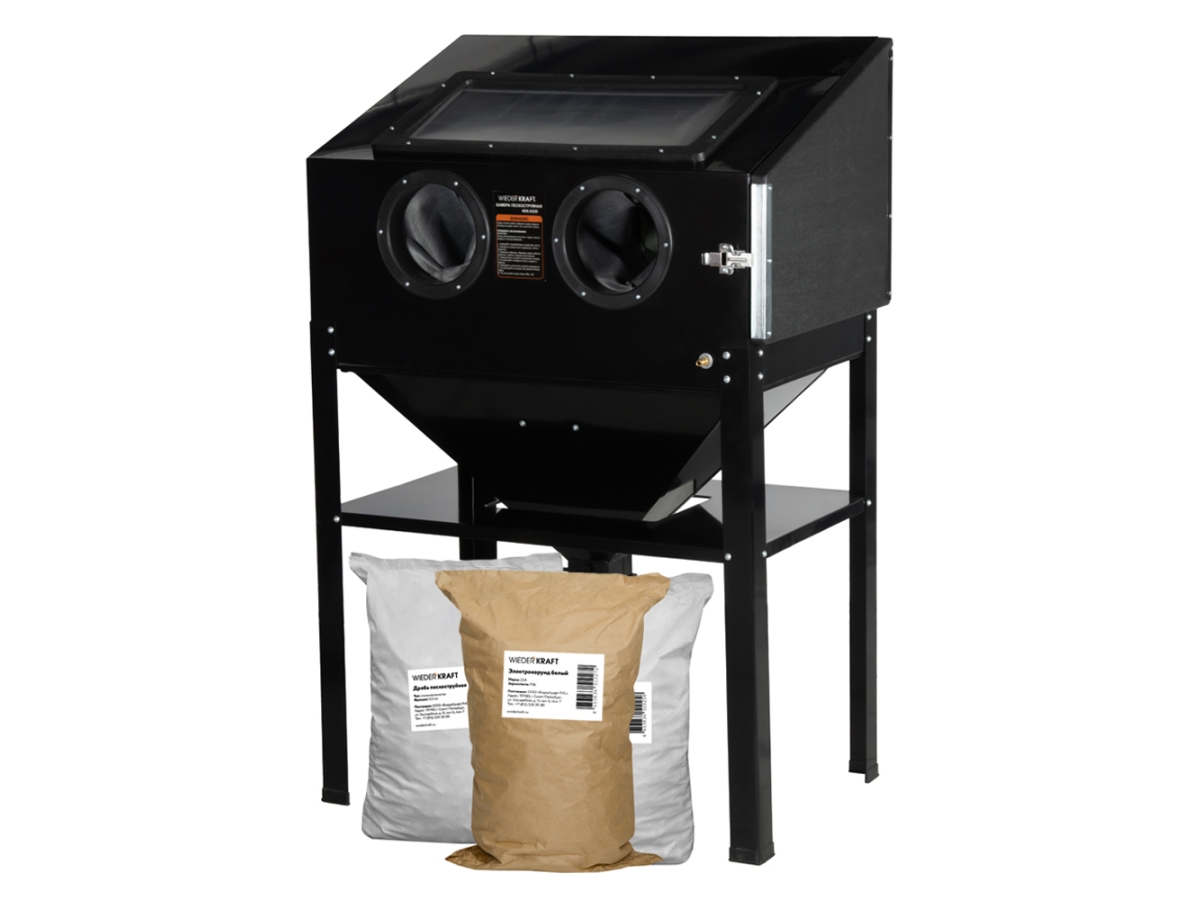 Напольная пескоструйная камера с системой очистки воздуха WiederKraft WDK-83220D объемом 220 литров. Поставляется с тремя видами абразивов: WDK-DR03 — колотая пескоструйная дробь с фракциями 0,3 мм, WDK-DR05 — колотая пескоструйная дробь с фракциями 0,5 мм и WDK-KR6 — белый электрокорунд с возможностью использования до 7 циклов. Предназначена для обработки деталей внутри замкнутого пространства самой камеры, что позволяет полностью предотвратить пылеобразование за ее пределами. Применяется для очистки поверхностей от грязи, ржавчины, краски и окалины после сварочных работ. Простая, надежная и неприхотливая в обслуживании пескоструйная камера с системой пылеудаления и электродвигателем для очистки воздуха (220 В). Легко вмещает крупные детали и агрегаты. Камера WDK-83220D оснащена электропневматической системой управления, смотровым окном, осветительной лампой, перчатками из толстой резины и комплектом абразивов. Специальное прозрачное окошко позволяет контролировать процесс очистки. С фронтальной стороны установлена дверца для технического обслуживания камеры. Широкие опорные ножки поглощают вибрации в процессе работы, обеспечивая высокую устойчивость оборудования. Корпус выполнен из металла высокой прочности.