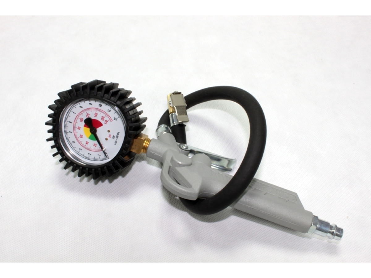 Инструкция по эксплуатации: Подсоедините шланг для подачи воздуха к пистолету. Для подачи и контроля вставьте носик в клапан шины, нажимая рычаг. Удерживая устройство в руке, проверьте давление в шине, для подкачки нажимайте на курок до тех пор, пока воздух не начнет выходить наружу, после чего отпустите курок, проверьте давление и повторяйте так до тех пор, пока давление на манометре не достигнет нужного значения. Для выпуска воздуха из шины отпустите рычаг и нажмите большим пальцем кнопку, обеспечивая выпуск воздуха.