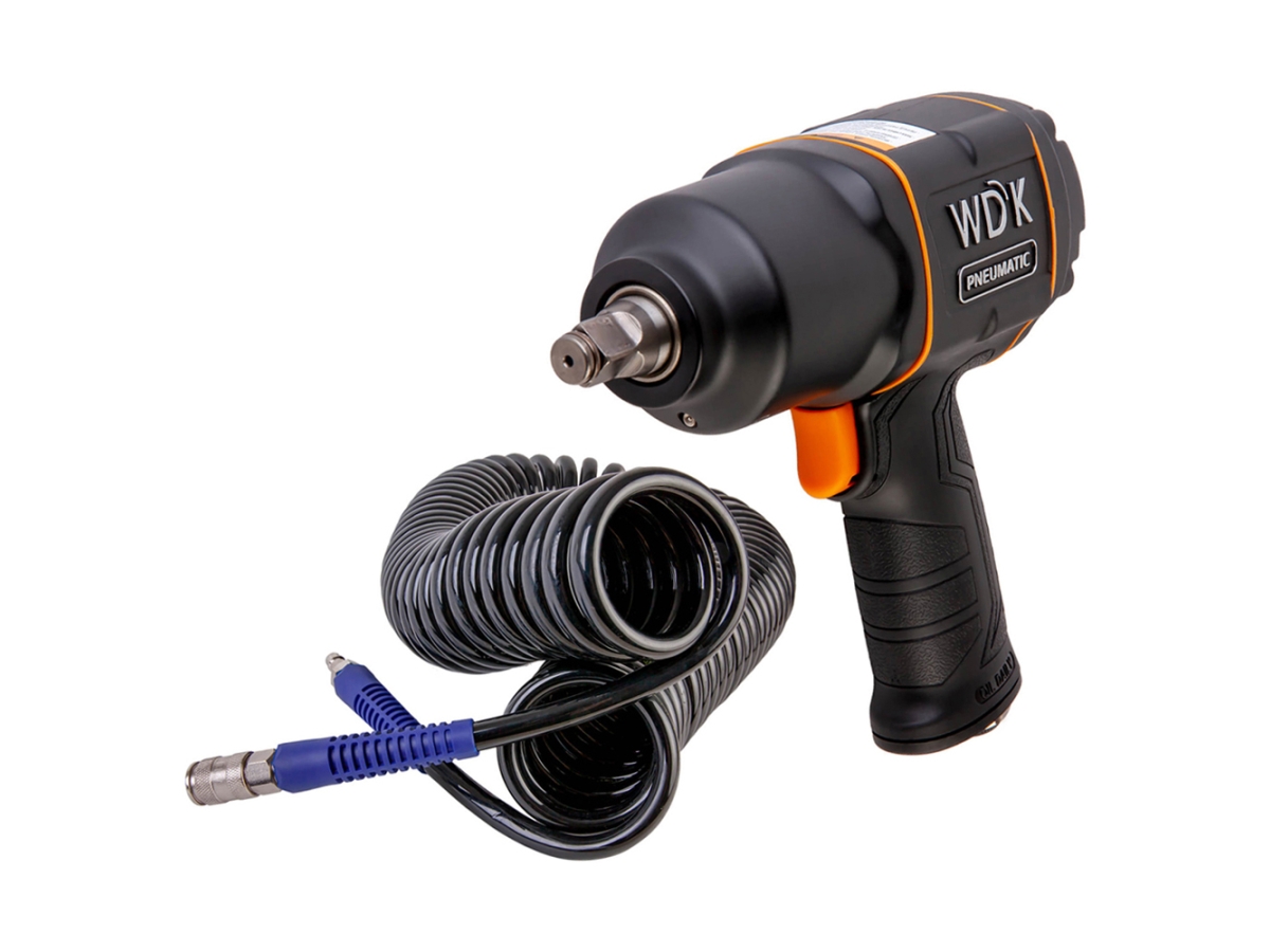 Гайковерт поставляется в комплекте пневматическим полиуретановым шлангом с фитингами БРС WDK-65810. Шланг витой, длина до 10 метров, внутренний диаметр 10 мм, внешний диаметр 14 мм. Спиральные шланги компании WiederKraft изготавливаются из модифицированного полиуретана нового поколения, который обладает уникальными свойствами. Сохраняют эластичность в широком диапазоне температур от -30 °C до +60 °C. Не трескаются при растягивании, наезде колесом, перегибе или переломе, и быстро восстанавливают свою форму. Обладают повышенной маслостойкостью, бензостойкостью, стойкостью к ультрафиолетовому излучению и сохраняют свои свойства более пяти лет.