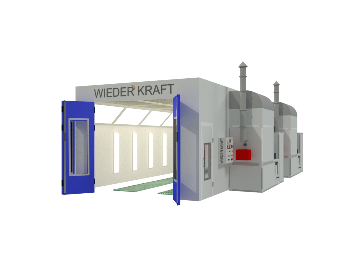 Окрасочно-сушильная камера с дизельными горелками Riello и приточно-вытяжным тепловентиляционным агрегатом. Используется для организации технологических процессов окраски и сушки лакокрасочных покрытий промышленного транспорта. Боковые стены состоят из сэндвич-панелей (негорючий пенополистирол толщиной 70 мм) и являются теплоизоляционными. Визуальный контроль позволяют осуществить 3-х створчатые ворота со встроенными смотровыми окнами. Можно установить дополнительный комплект ворот с целью организации сквозного проезда. Установить приточно-вытяжную группу с любой стороны в процессе монтажа позволяет унифицированная конструкция.