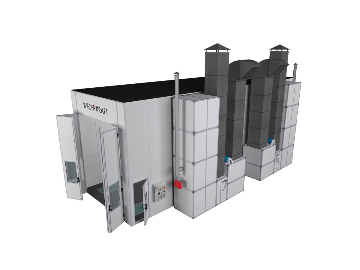 Окрасочно-сушильная камера с дизельными горелками Riello и приточно-вытяжным тепловентиляционным агрегатом. Используется для организации технологических процессов окраски и сушки лакокрасочных покрытий грузового транспорта и автобусов. Боковые стены состоят из сэндвич-панелей (негорючий пенополистирол толщиной 70 мм) и являются теплоизоляционными. Визуальный контроль позволяют осуществить 3-х створчатые ворота со встроенными смотровыми окнами. Можно установить дополнительный комплект ворот с целью организации сквозного проезда. Установить приточно-вытяжную группу с любой стороны в процессе монтажа позволяет унифицированная конструкция.