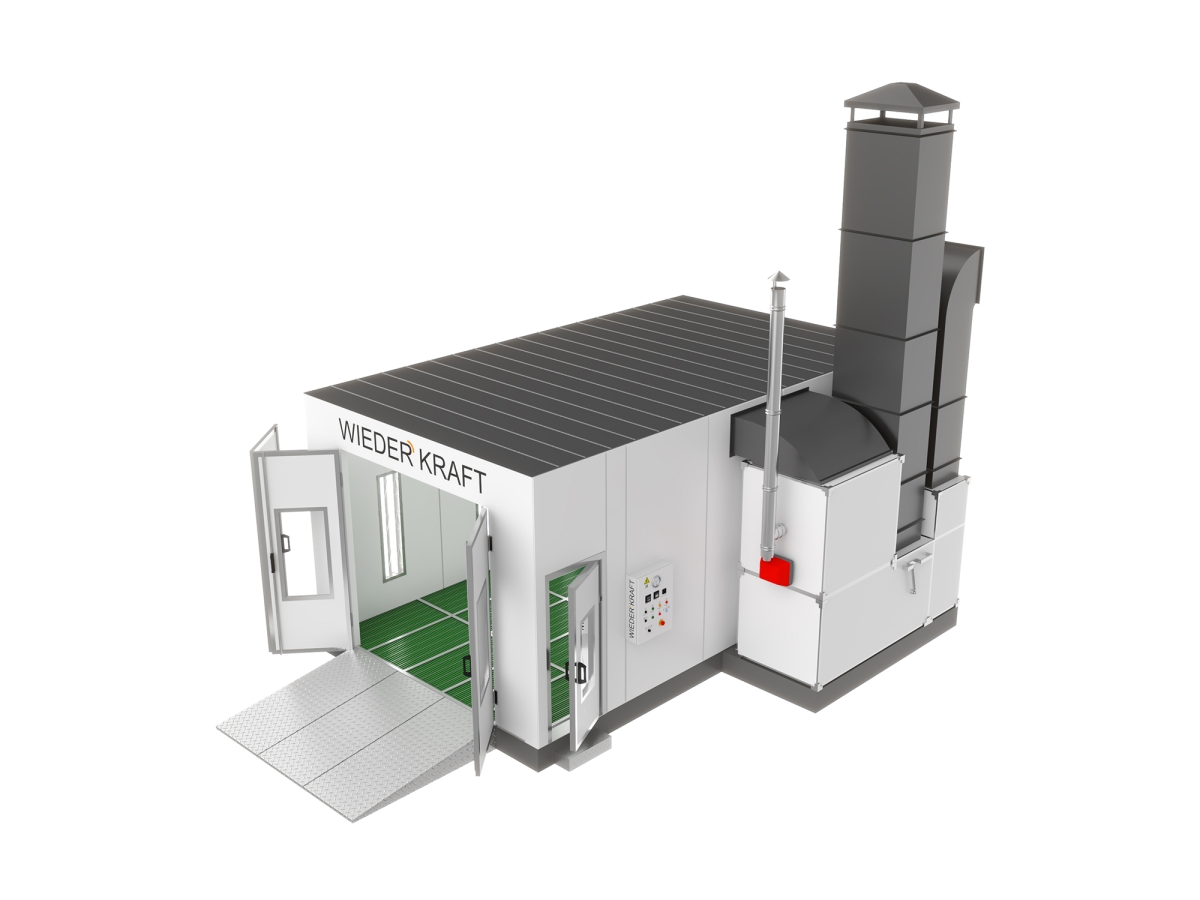Окрасочно-сушильная камера ОСК с дизельной горелкой Riello и приточно-вытяжным тепловентиляционным агрегатом. Используется для сушки лакокрасочных покрытий и организации технологических процессов окраски. Боковые стены состоят из сэндвич-панелей (негорючий пенополистирол толщиной 53 мм) и являются теплоизоляционными. Визуальный контроль позволяют осуществить 3-х створчатые ворота со встроенными смотровыми окнами. Можно установить дополнительный комплект ворот с целью организации сквозного проезда. Установить приточно-вытяжную группу с любой стороны в процессе монтажа позволяет унифицированная конструкция.