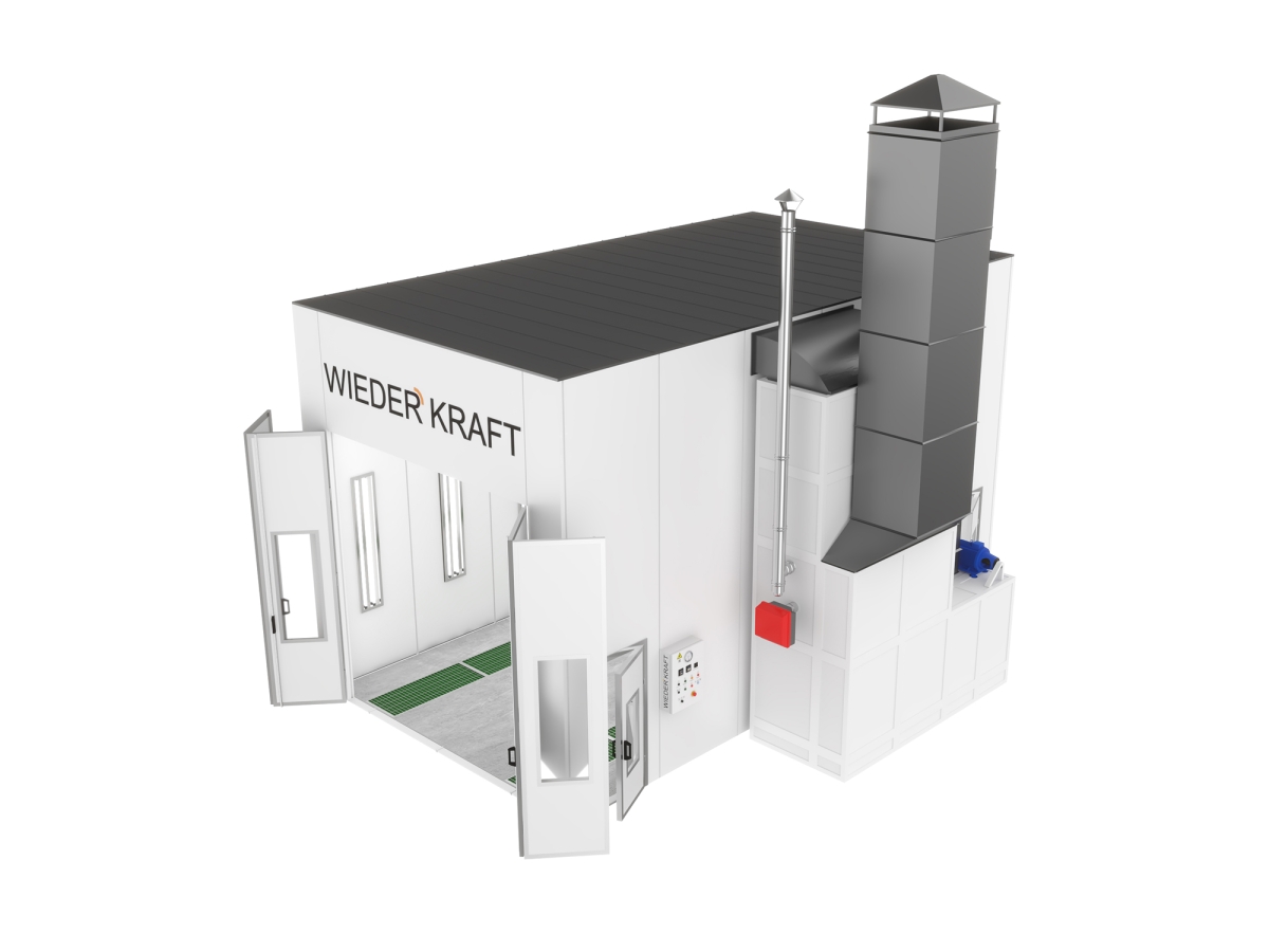 Окрасочно-сушильная камера с дизельными горелками Riello и приточно-вытяжным тепловентиляционным агрегатом. Используется для организации технологических процессов окраски и сушки лакокрасочных покрытий грузового транспорта. Боковые стены состоят из сэндвич-панелей (негорючий пенополистирол толщиной 70 мм) и являются теплоизоляционными. Визуальный контроль позволяют осуществить 3-х створчатые ворота со встроенными смотровыми окнами. Можно установить дополнительный комплект ворот с целью организации сквозного проезда. Установить приточно-вытяжную группу с любой стороны в процессе монтажа позволяет унифицированная конструкция.