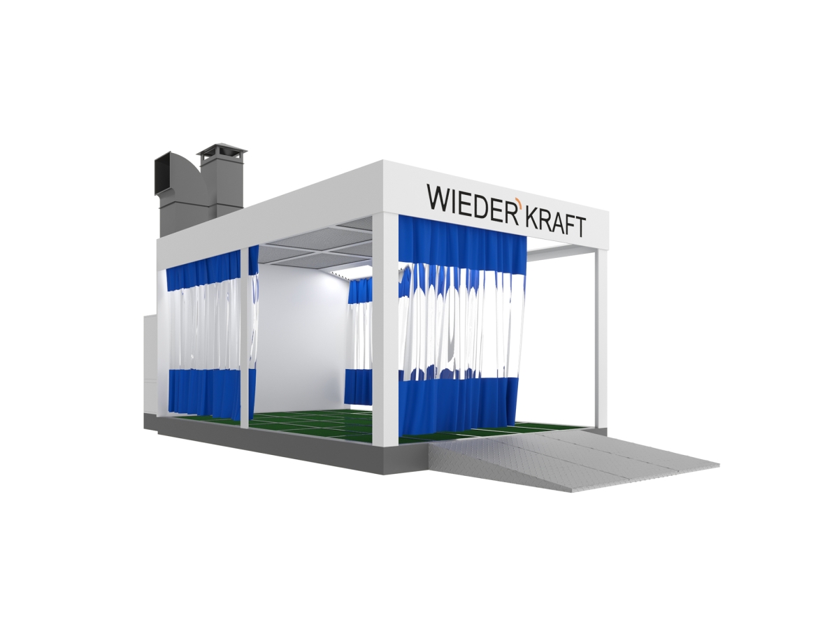Профессиональный комплекс оборудования на один пост с металлическим основанием и полнорешетчатыми полами. Пост предназначен для создания требуемых технологических условий при проведении подготовительных работ к окраске. В пленуме с опорой на столбах по всей площади установлены фильтры тонкой очистки. В комплект входят шторы для изоляции от основного помещения и 2 аппарели.