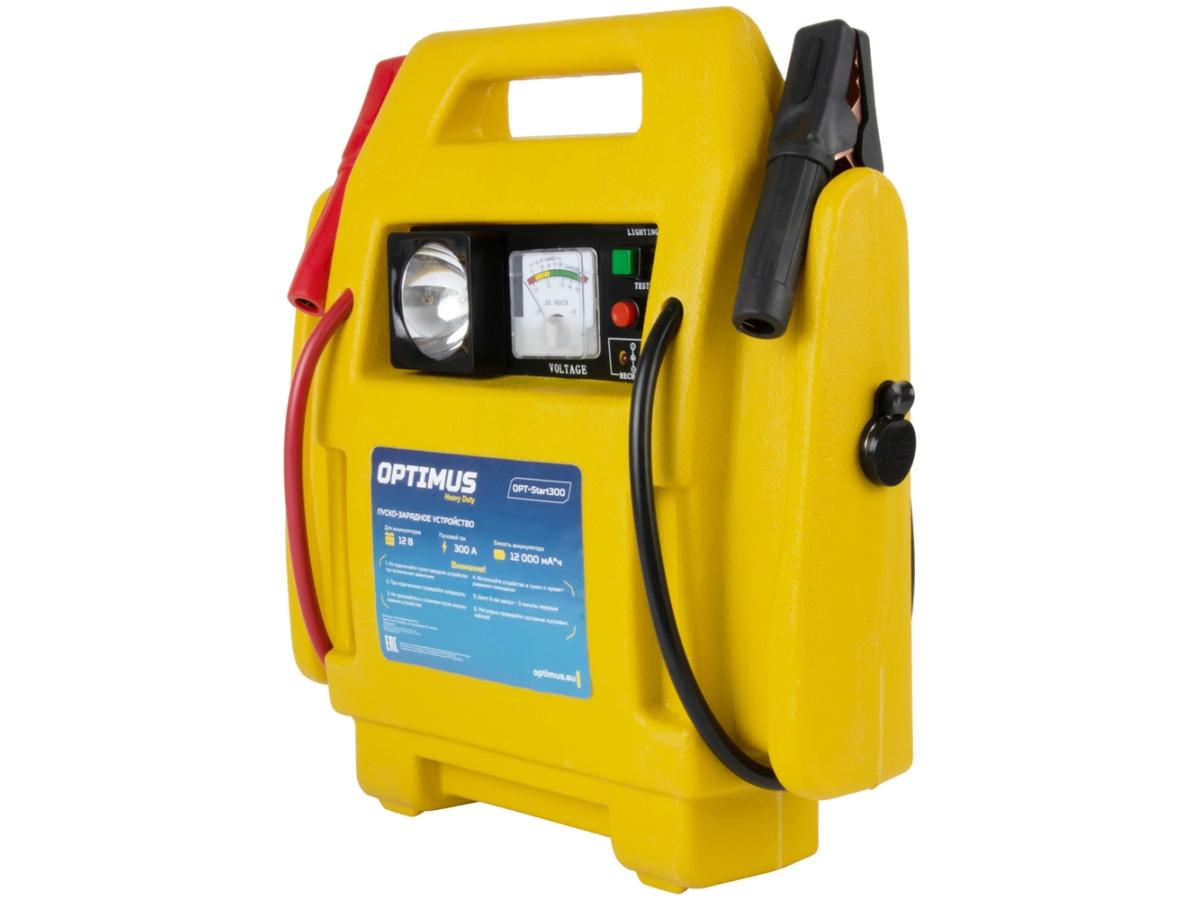 OPT-Start300 многофункционален и удобен: позволяет осуществить запуск авто с АКБ 12 В; обладает встроенными амперметром, компрессором с манометром, фонарем с тремя вариантами функционирования; в нем есть выход под прикуриватель, через который можно зарядить девайс (альтернативный метод – от классической сети 220 В).
