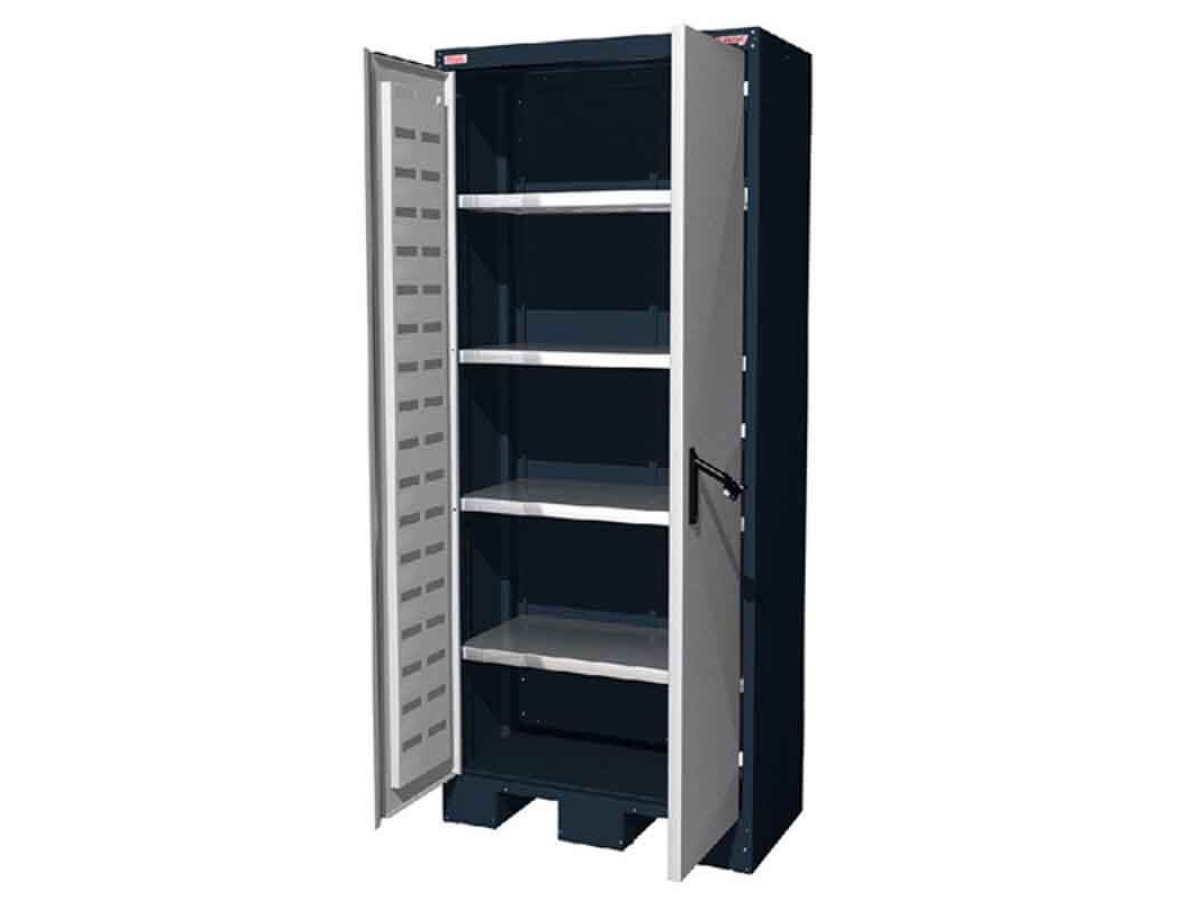 Металлический шкаф 08.3004 для организации эргономичного хранения инструмента в складских, производственных и иных видах помещений. В комплекте поставляются четыре оцинкованные полки, способные выдерживать распределенную нагрузку в пределах 200 кг. Запирание дверей происходит при помощи ригельной системы с тягами.