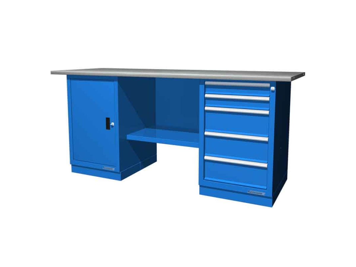 Верстак с двумя тумбами (тумба с дверцей и тумба с пятью ящиками). Две тумбы позволяют хранить необходимое количество разнообразного инструмента или два комплекта личного инвентаря мастера (при работе посменно). Лучший вариант при проведении работ с габаритными предметами и работе с большим количеством инструмента или расходных материалов. Верстак окрашен глянцевым порошковым покрытием, обеспечивающим прекрасный внешний вид и простоту в уходе. Для удобства транспортировки верстак поставляется в разобранном виде в четырех упаковках.