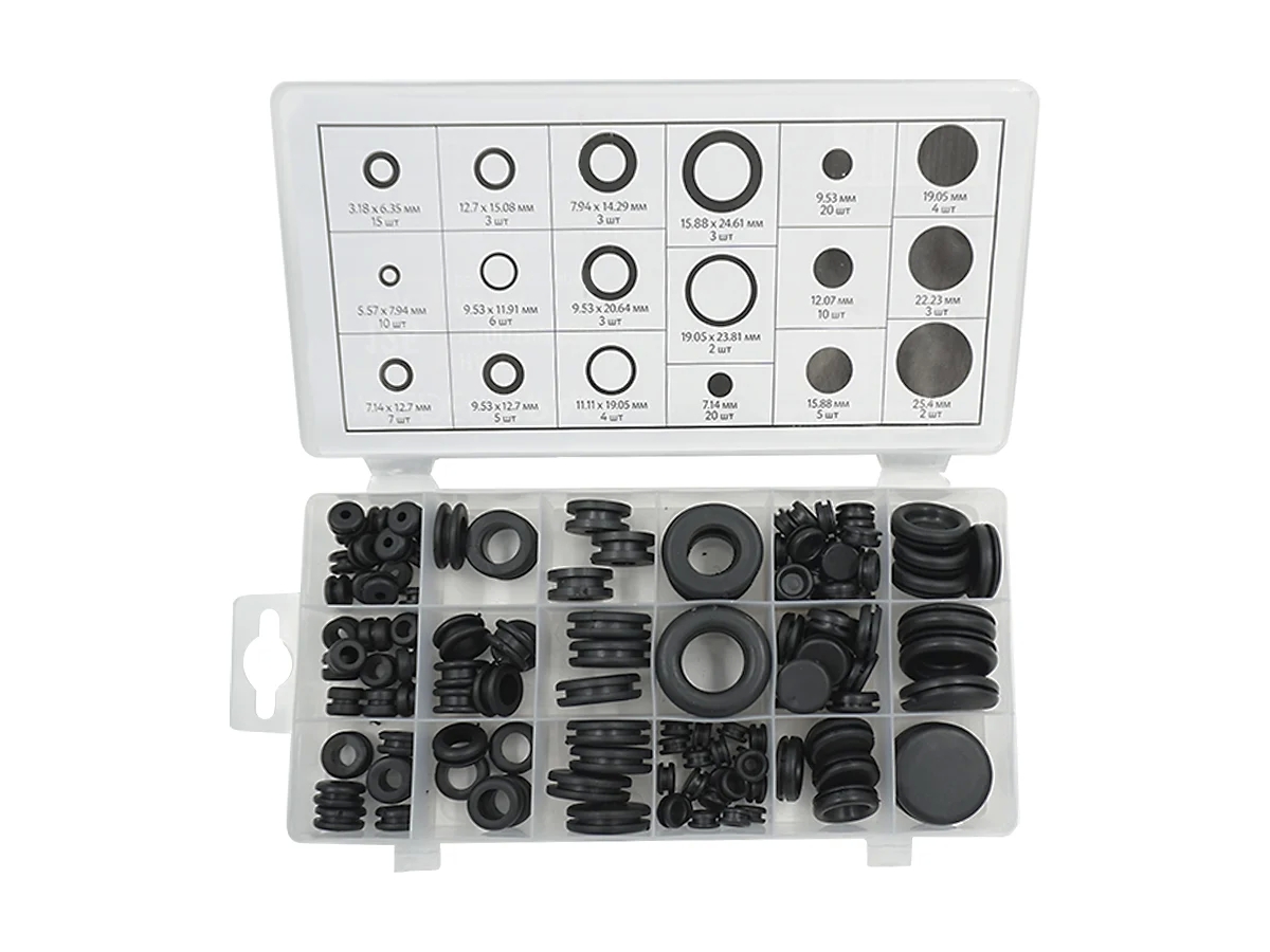 Набор WDK-214042-2 состоит из 125 двухсторонних резиновых уплотнительных колец и заглушек для отверстий различных размеров. Благодаря им обеспечивается защита проводов и жгутов проводки от перетирания.