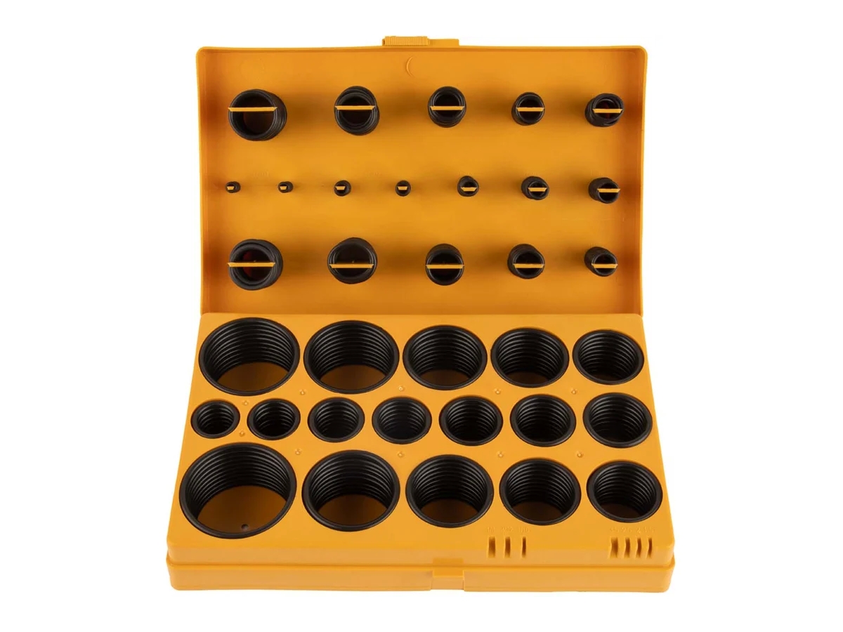 Набор содержит 407 резиновых кольца, представленных в 32 размерах, и поставляется в удобном и прочном пластиковом кейсе с секциями под каждый размер уплотнительного кольца.
