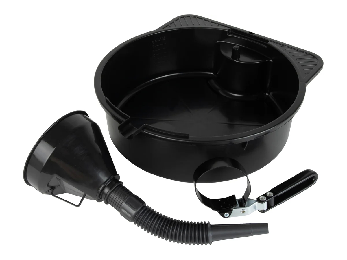 - Поддон для сбора отработанного масла и других жидкостей. Имеет специальный носик для слива масла и крепление для масляного фильтра – можно повесить снятый фильтр, чтобы остатки масла стекли в поддон без лишних капель и грязи.