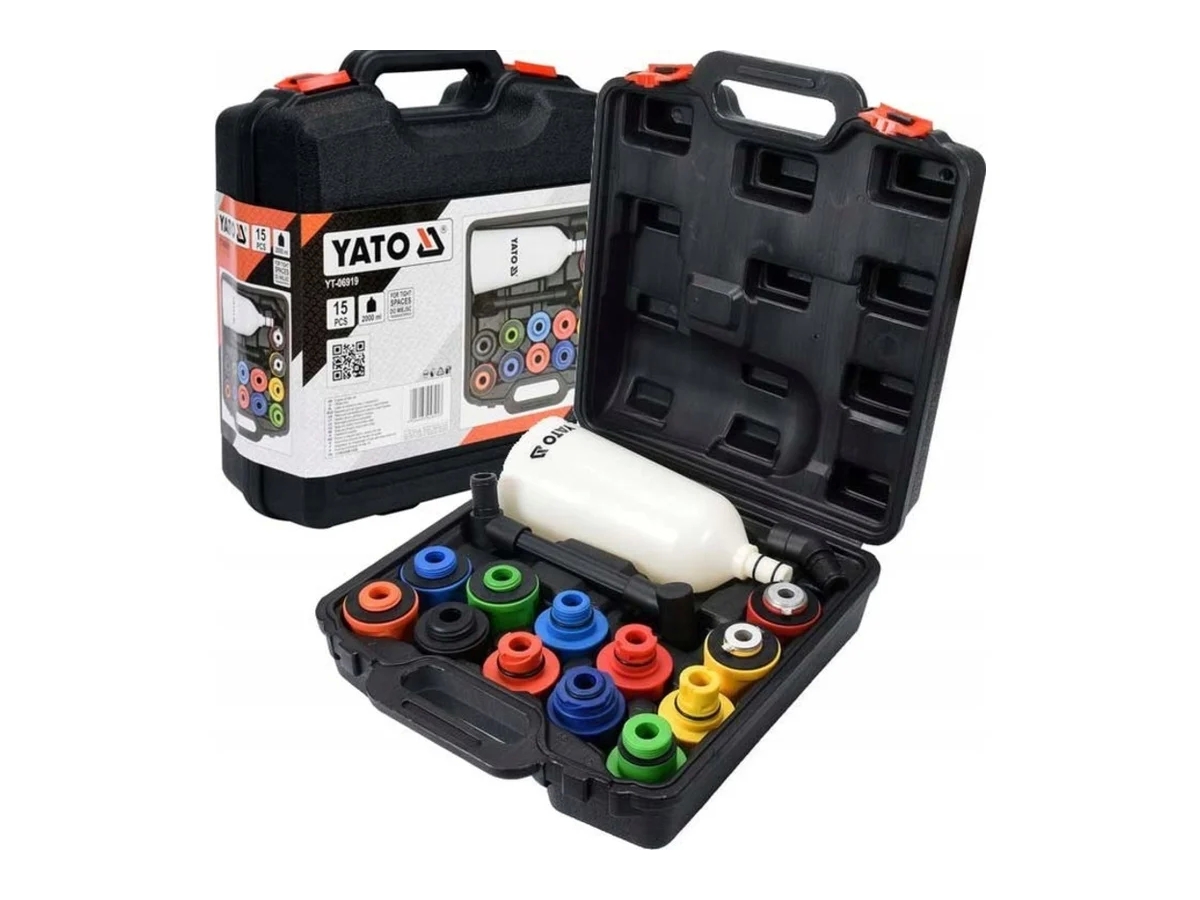 Комплект для доливки моторного масла 15 предметов YATO YT-06919 предназначен для доливки моторного масла через труднодоступные заливные горловины. Он позволяет легко доливать масло с помощью воронки, рукава и переходника, предотвращая его проливание или загрязнение деталей двигателя.