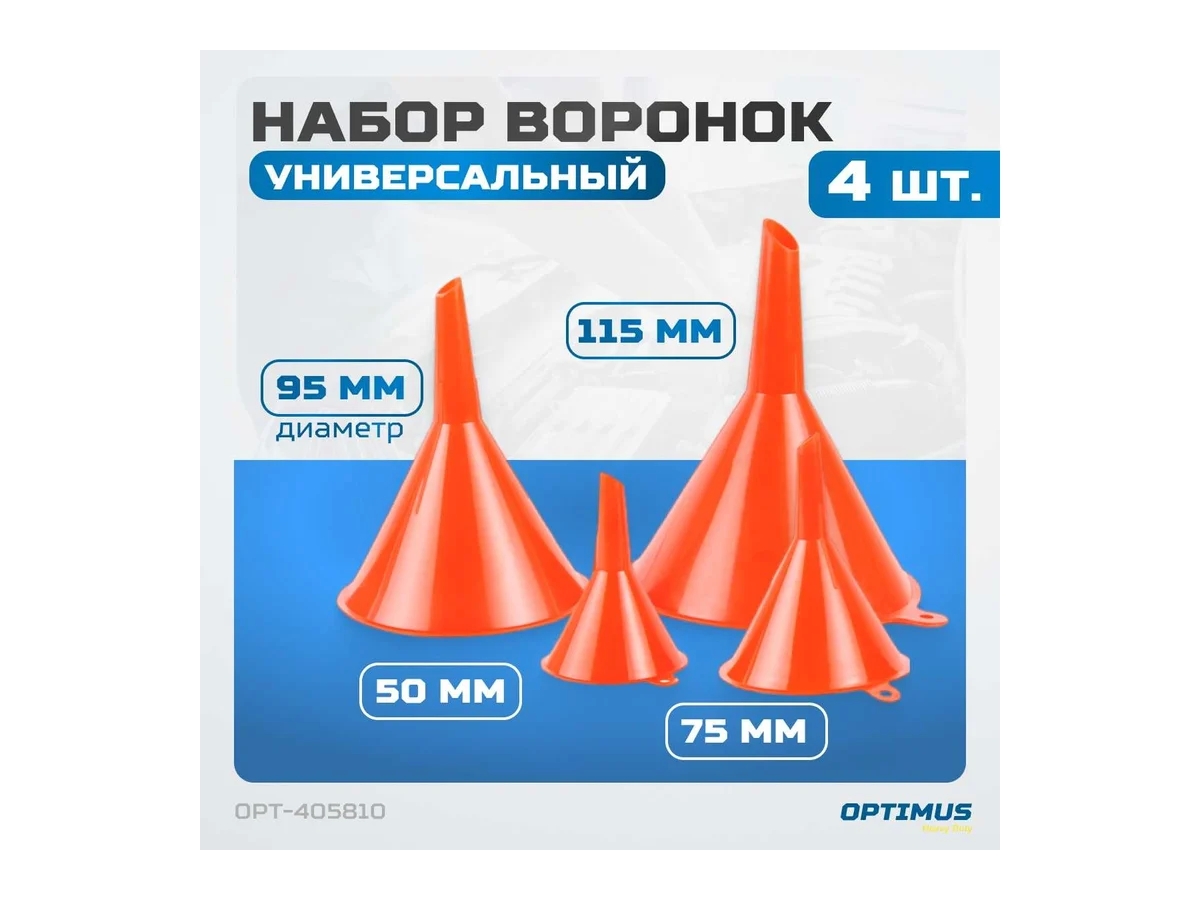 Набор воронок Optimus OPT-405810 представляет собой незаменимые инструменты для удобного, быстрого и аккуратного заливания горюче-смазочных материалов в узкое горлышко емкостей. Эти воронки обеспечивают простоту и эффективность процесса заливки. В комплект входят 4 воронки разных диаметров, что позволяет подобрать оптимальный размер под конкретную задачу.