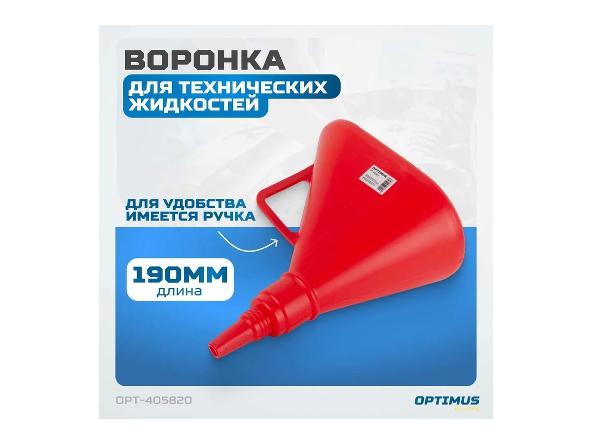 Воронка с гибким носиком-лейкой Optimus OPT-405820 подходит для удобного, быстрого и аккуратного заливания горюче-смазочных материалов. Изготовлена из пластмассы, в комплекте поставляется гибкий носик-лейка, который облегчает работу в труднодоступных местах. Для удобства использования на корпусе воронки сделана ручка.