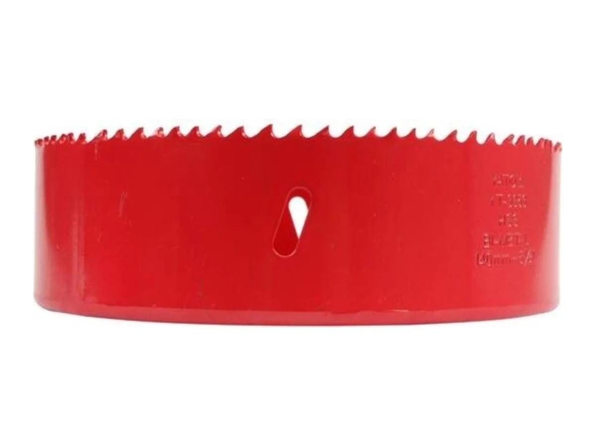 Пила кольцевая биметаллическая 114 мм YATO YT-3349 внешне напоминает отрезок трубы с острыми зубцами по краям. Состоит из цилиндрической основы и рабочей кромки. Режущая часть способна обрабатывать материалы с прочностью до 1100 Н/мм². Форма и расположение зубьев способствуют выполнению ровных срезов без образования заусенцев. По бокам изделия находятся отверстия, через которые производится вентиляция режущей кромки и удаляется стружка.