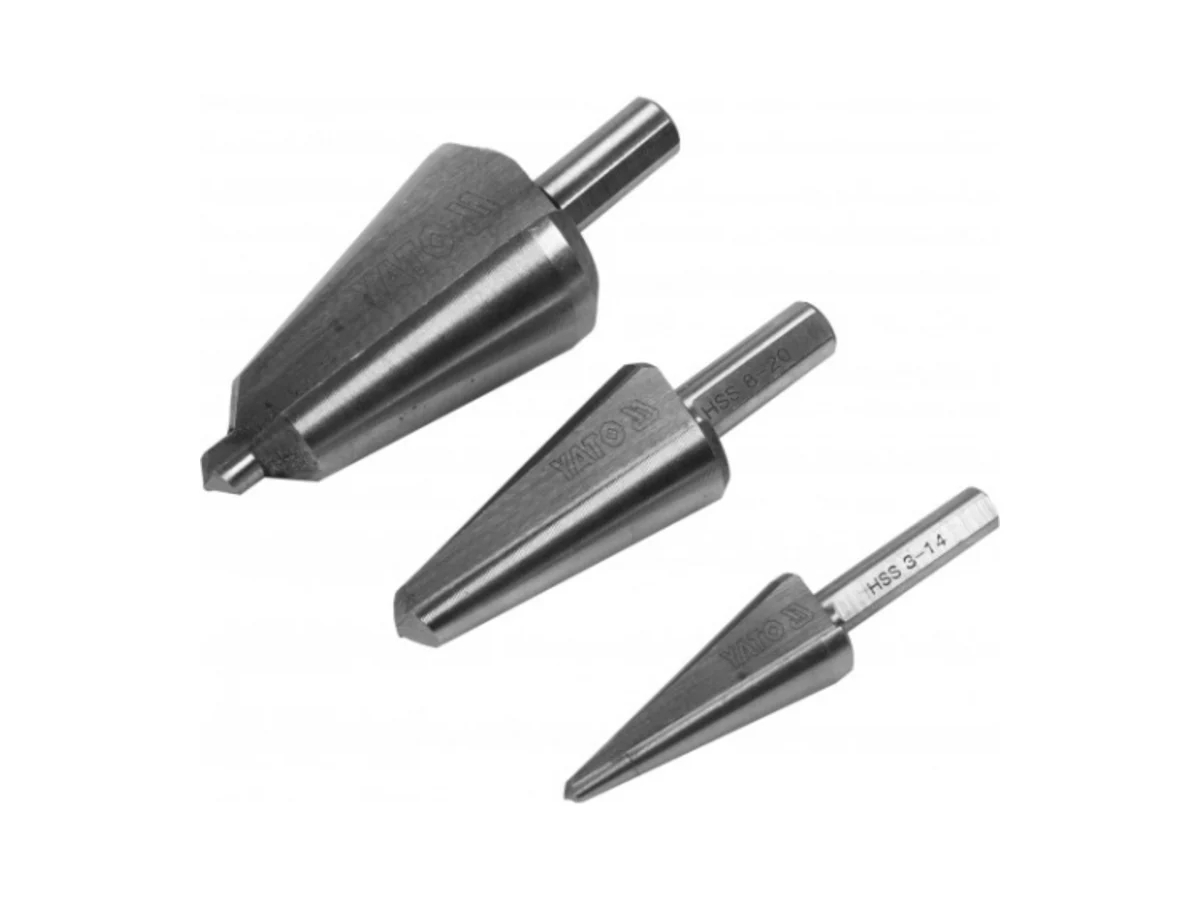 Набор конусных сверл 3 предмета YATO YT-44730 используется для выполнения сквозных отверстий в листовой стали. Благодаря коническому профилю с помощью сверл выполняют отверстия различного диаметра, не меняя оснастку.