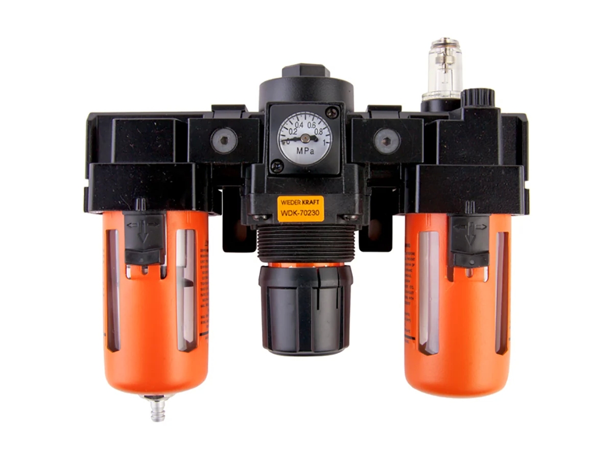 Блок подготовки воздуха WIEDERKRAFT WDK-70230 используется совместно с компрессорным оборудованием и пневмоинструментом. Фильтр-масло/влагоотделитель применяется для очистки сжатого воздуха от механических частиц, воды и минерального масла. Лубрикатор предназначен для подачи смазывающих материалов и поддержания постоянной концентрации воздух-масло. Имеет возможность регулировки подачи масла. Регулятор давления применяется для контроля и фиксации давления в пневмосистеме. Уровень давления регулируется с помощью вентиля и отображается на встроенном манометре. Скоба-держатель используется при сборке и закреплении блока подготовки воздуха на вертикальной поверхности.