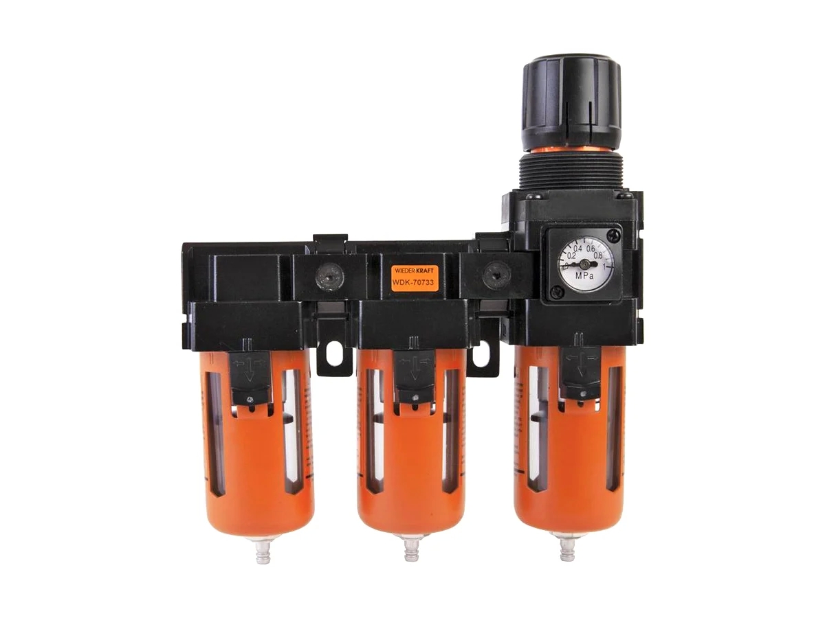 Модульная группа WIEDERKRAFT WDK-70733 предназначена для очистки сжатого воздуха от механических частиц, воды и минерального масла. Блок оснащен трехступенчатой фильтрацией, который обеспечивает высокий уровень очистки. Имеется регулятор давления, который предназначен для контроля и фиксации давления в пневмосистеме.