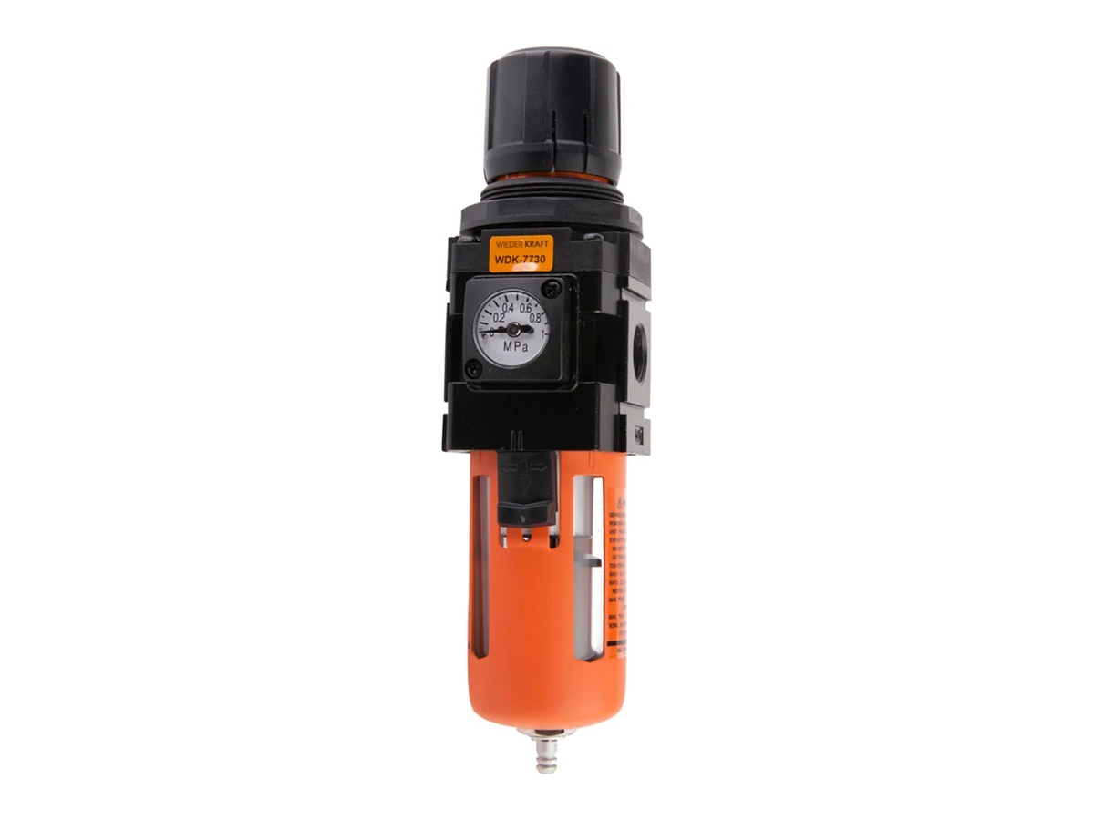 Фильтр-масло/влагоотделитель WIEDERKRAFT WDK-7730 используется совместно с пневмоинструментом и применяется для очистки сжатого воздуха от механических частиц, воды и минерального масла. Также регулирует давление и поддерживает его на необходимом уровне. Объединение фильтра и регулятора в одном позволяет уменьшить габариты системы. Устройство оснащено манометром, предназначенным для измерения давления.
