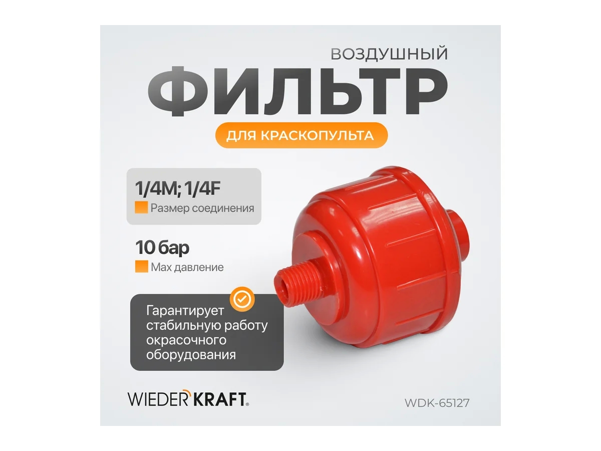 Воздушный фильтр для краскопульта WIEDERKRAFT WDK-65127 предназначен для дополнительной очистки сжатого воздуха при работе с окрасочным оборудованием. Устанавливается непосредственно на ручку краскопульта и эффективно очищает воздух, гарантируя стабильную работу окрасочного оборудования.