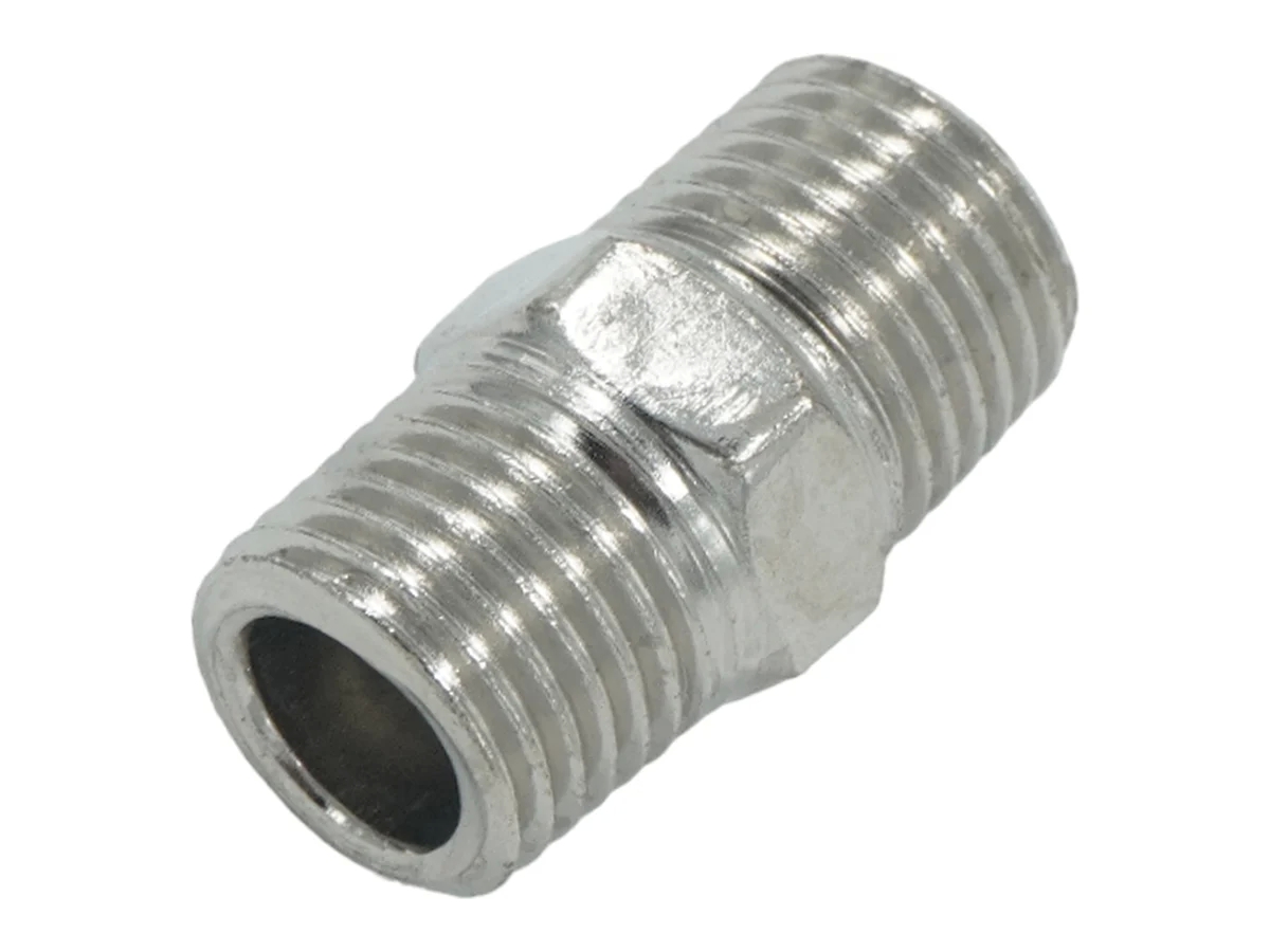 Стальной прямой переходник 1/4"M-1/4"M применяется для подключения пневмоинструмента и элементов пневмосистемы. Обеспечивает переход между двумя резьбами одинакового размера.