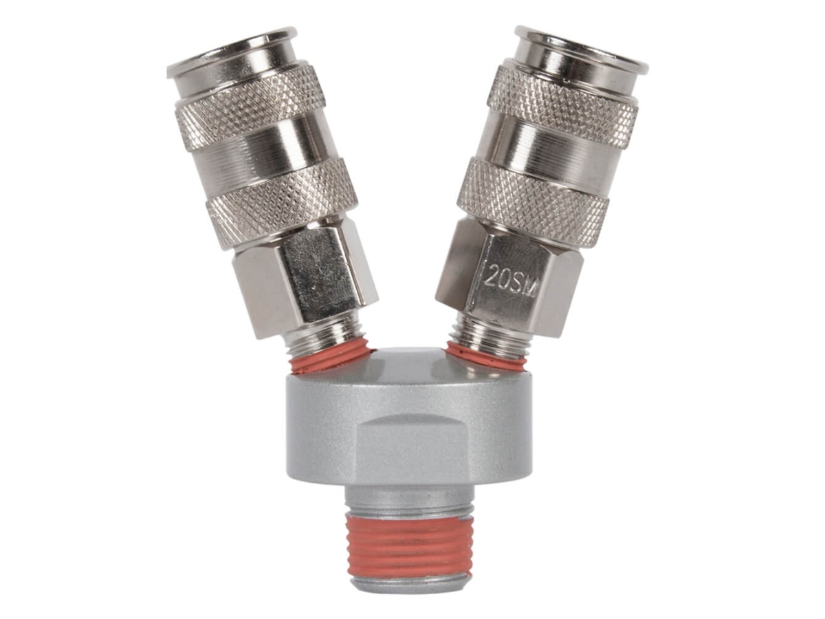 Разветвитель пневматический V-образный WIEDERKRAFT WDK-82MV применяется для одновременного подключения двух пневмоинструментов к одному источнику воздуха. Оснащен двумя быстросъемными разъемами типа «мама» (рапид EURO). На входе предусмотрены два варианта резьбы: наружная 1/4M и внутренняя 3/8F, что делает устройство универсальным при подключении. Изготовлен из прочной стали.
