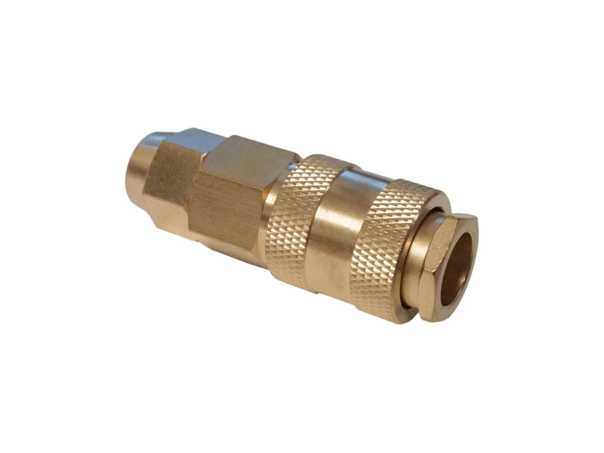 Латунный разъем "мама" быстросъемный с обжимным креплением под шланг 8*12 мм. Предназначен для присоединения к пневматическим шлангам через обжимное крепление. Применяется совместно с быстросъемным соединением "папа".