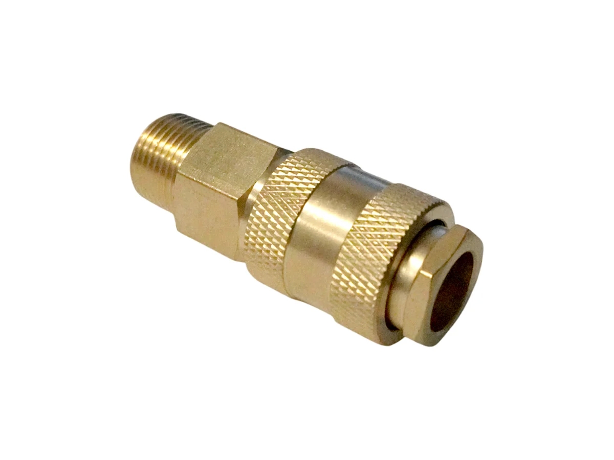 Латунный разъем "мама" быстросъемный с размером наружной резьбы 3/8". Предназначен для установки на выходном конце различных элементов пневмосистемы для создания автоматических прерывателей подачи воздуха. Латунный корпус исключает возможность появления коррозии.